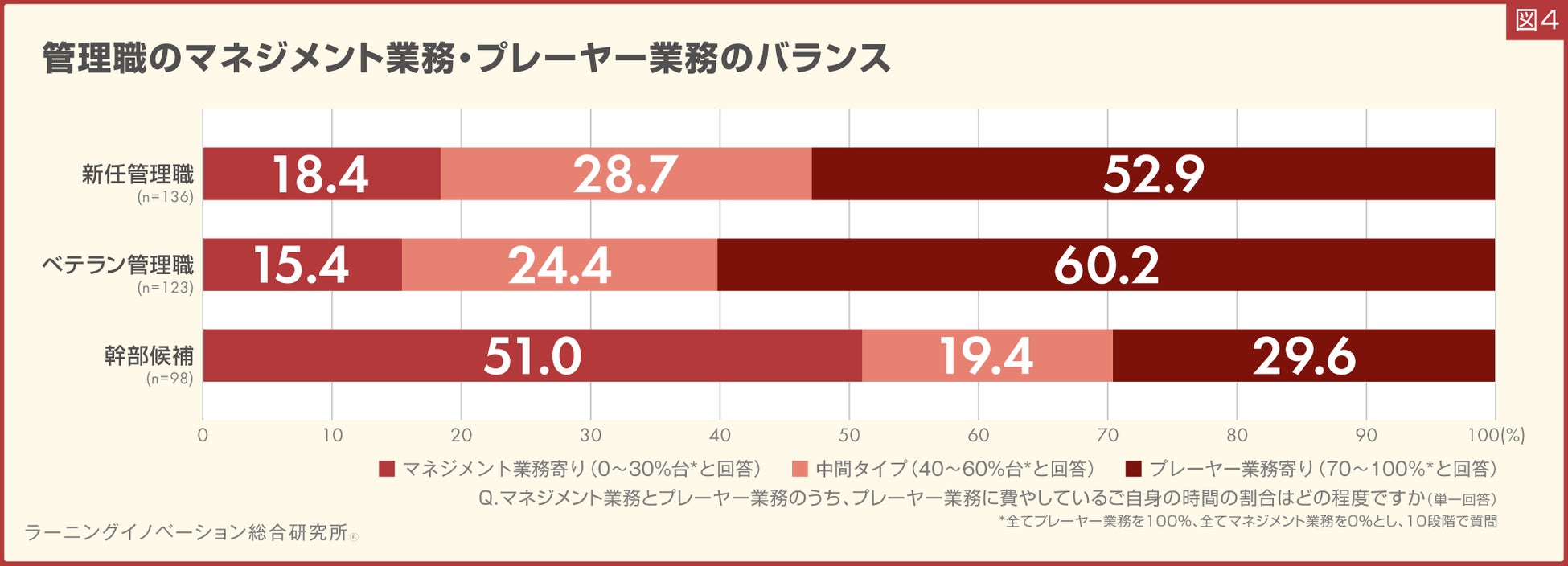 4.管理職の業務内容、新任は半数以上、ベテランは6割以上が「プレーヤー業務寄り」。幹部候補は半数以上が「マネジメント業務寄り」