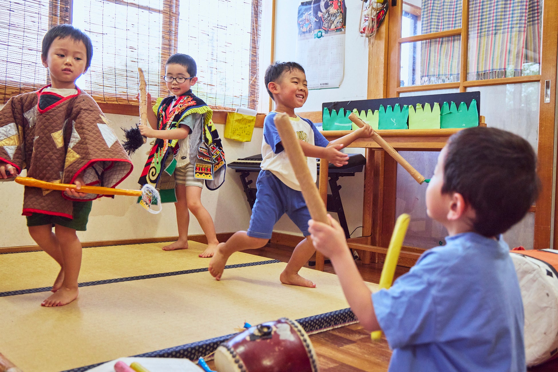 園では、地域に根づく文化がこどもたちの園生活に自然と溶け込んでいます。例えば、一年を通じて園には太鼓の音が響き、こどもたちはミルク缶や段ボール箱を使って、地元の伝統芸能「石見神楽(いわみかぐら)」の囃子を楽しそうに奏でます。文化は特別なイベントではなく、日常の延長にあるものとして体感できる環境です。また、地域の季節行事や収穫体験、カフェでの交流などを通して、家族全体で地域の営みに寄り添う時間を過ごせます。