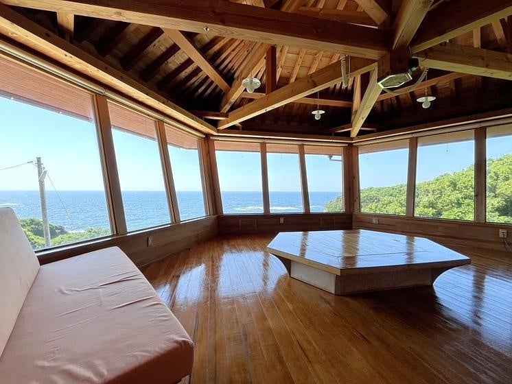 まるでプライベートビーチのような海を望む絶景に建つ別荘。サウナやBBQなどアウトドア体験が充実し、夏は眼下の海で海水浴や釣りも満喫できます。