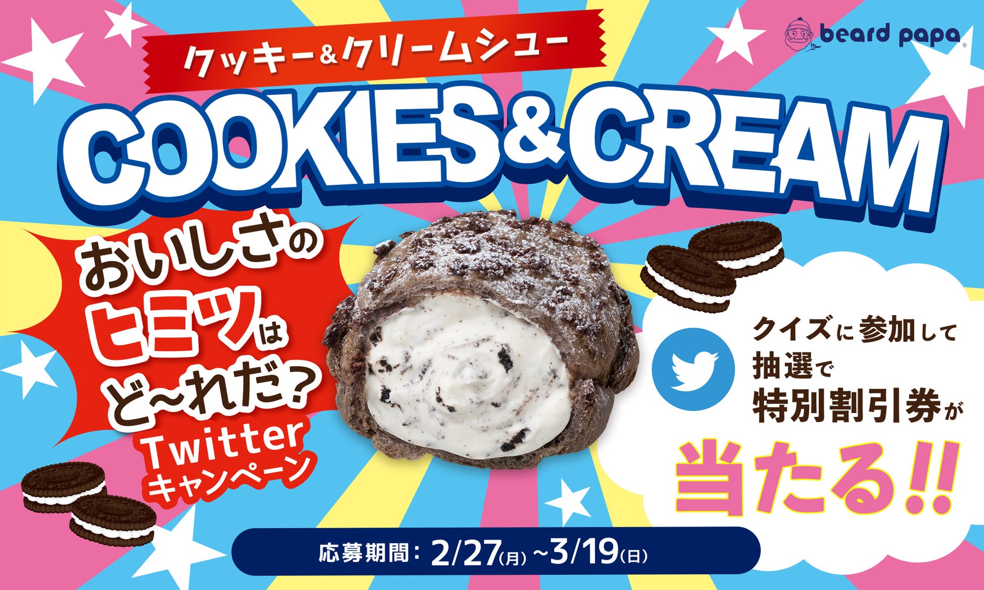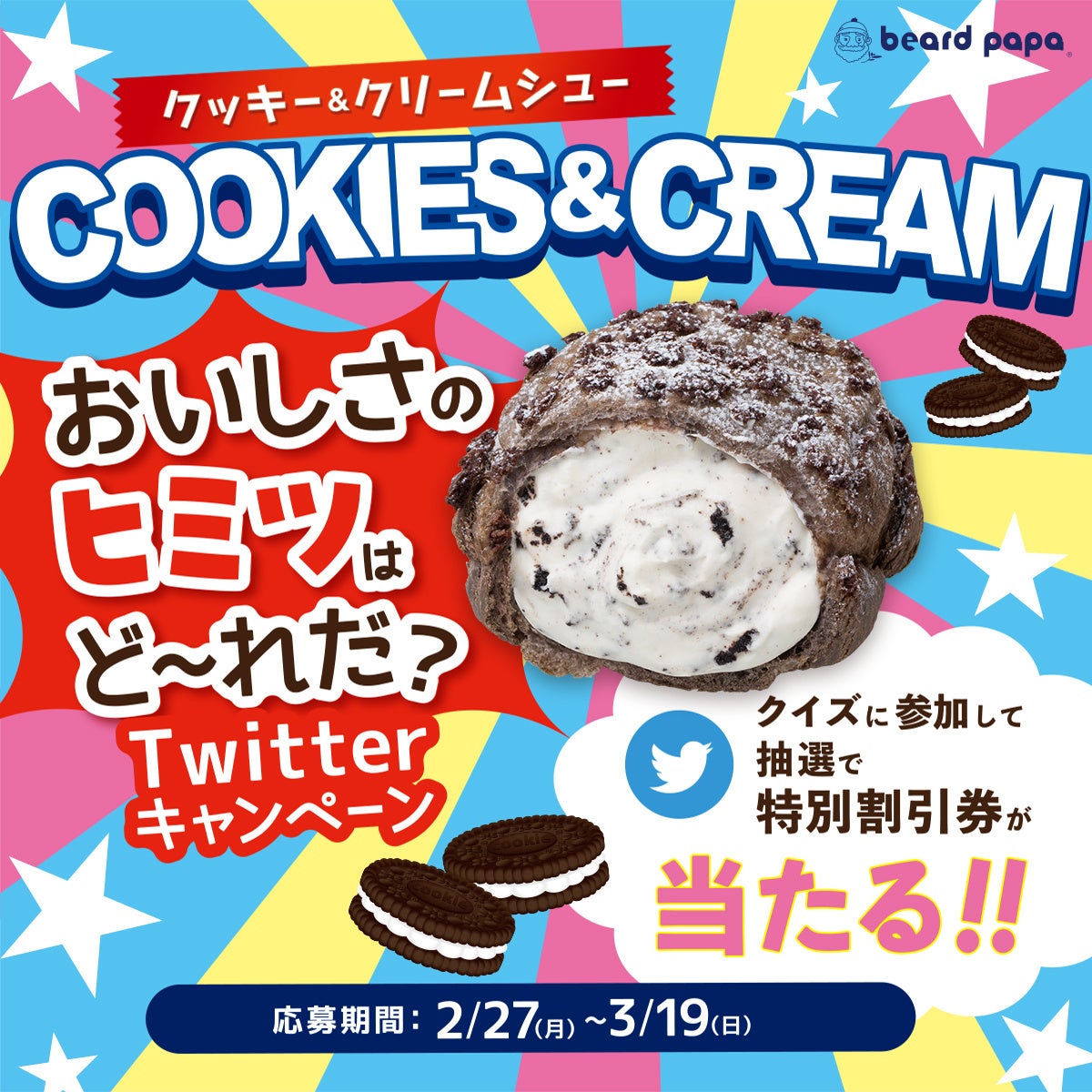 2月27日(月)から3月19日(日)までの期間、「クッキー&クリームシューのおいしさのヒミツはど~れだ?」と題したTwitterキャンペーンを実施いたします。ビアードパパ公式Twitterをフォローし、クイズに参加(ツイート)いただいた方の中から抽選で10名様に、ビアードパパ特別割引券(500円分)をプレゼント!詳しくはビアードパパ公式Twitterをご確認ください。