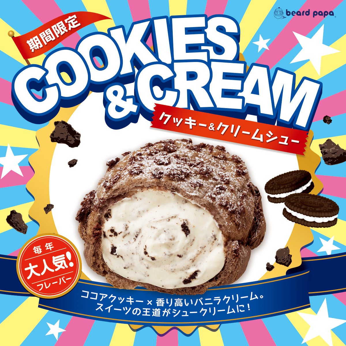 ビアードパパから“クッキー&クリームシュー”が登場。ザクザク食感のショコラクッキーシュー生地にブラッククランチ入りバニラクリーム!スイーツ王道の組み合わせをシュークリームで堪能しよう。