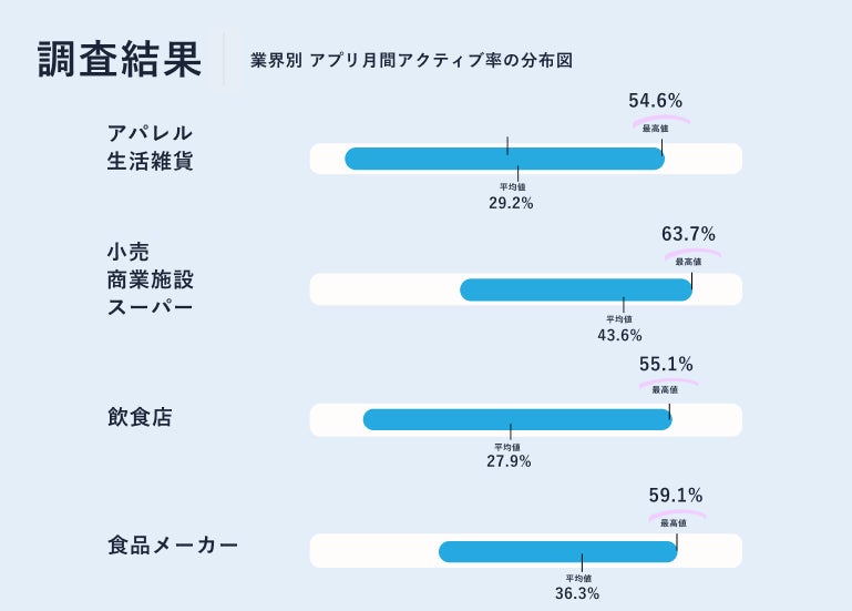 アクティブ率の平均値は、業界ごとの購買頻度が大きく影響していると考えられます。そのため、本調査の結果を活用する際は、自社の購買頻度や顧客とのコミュニケーション手法を考慮し、適切なアプリKPIの設定と効果測定を行うことが重要です。