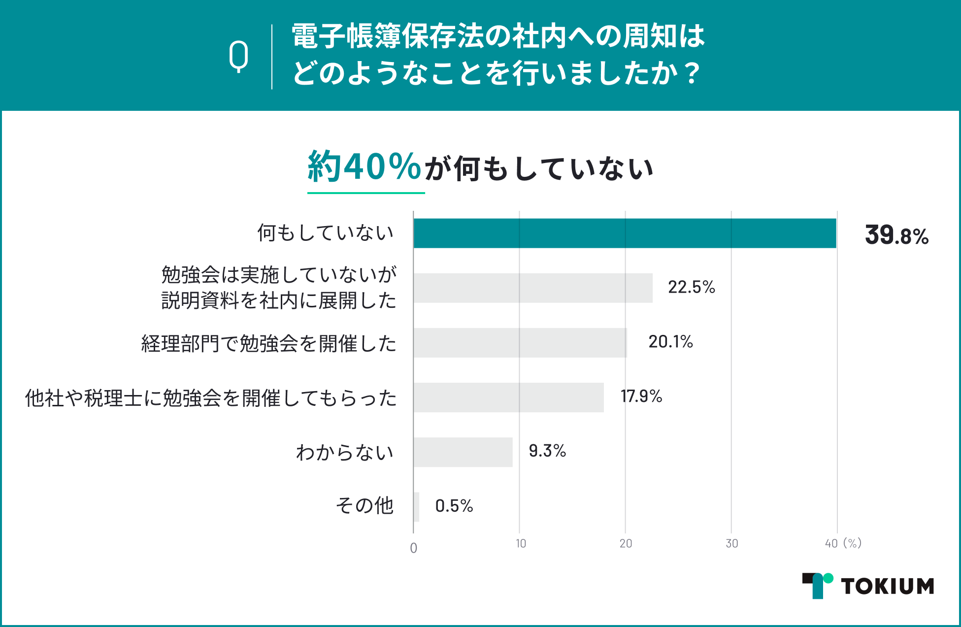 「電子帳簿保存法の社内への周知はどのようなことを行いましたか?」という質問に対し、39.8%が「何もしていない」と回答しました。経理以外の社員が正しく電子帳簿保存法を理解できるか不安に感じている一方で、社内への周知を何もしていない企業が多いことがわかりました。