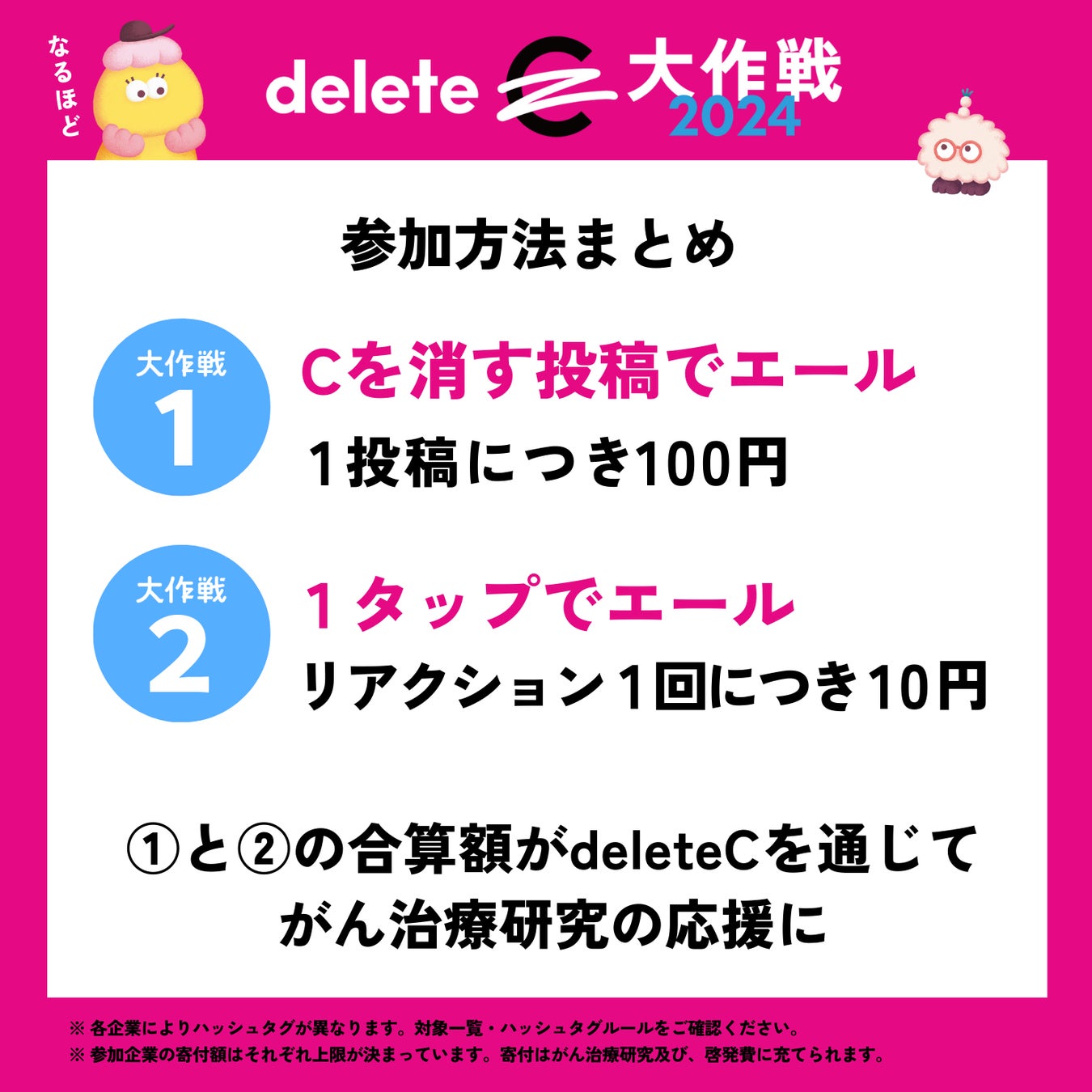 1投稿あたり100円が、1リポスト/1シェア/いいね(※1)/1再生/あたり10円が、がん治療研究への寄付・啓発費用として、当社からdeleteCに贈られます(※2)。