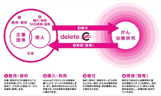 認定NPO法人deleteCは、個人、企業、組織などの立場を越え、がんを治せる病気にしたい、という想いを自由に意思表示することで、誰もががん治療研究を応援できる仕組みをつくり、がん治療研究への寄付と啓発を通じて、1日でも早く「がんを治せる病気にする日」を手繰り寄せることに貢献します。具体的には、プロジェクトに参加する企業・団体・自治体・個人が自身のブランドロゴや商品、またはサービス名からCancerの頭文字である「C」の文字を消し、deleteCのロゴやコンセプトカラーを使うなどしたオリジナル商品・サービスを制作・販売・提供します。購入金額の一部はdeleteCを通じて、医師・研究者が推進するがん治療研究と啓発費用として寄付されます。