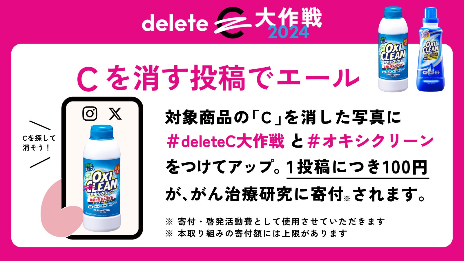 さらに、同時期に関東を中心に展開するスーパーマーケット サミットにて開催される、買い物が応援につながる「deleteC大作戦 2024 in サミット」にも参加し、オキシクリーン1商品の購入につき1円ががん治療研究への寄付につながります。