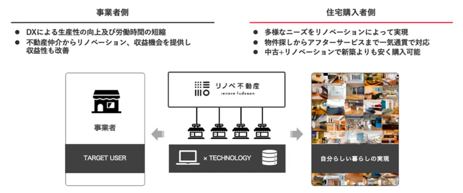 本提携において、希望加盟店はリノベ不動産にも加盟することが可能となり、それによってリノベーションについてのノウハウを吸収することで、中古住宅購入希望者に対してこれまでの物件のご紹介に加え、「中古+リノベーション」の住宅購入からリノベーションまでをワンストップにて提案が可能になります。