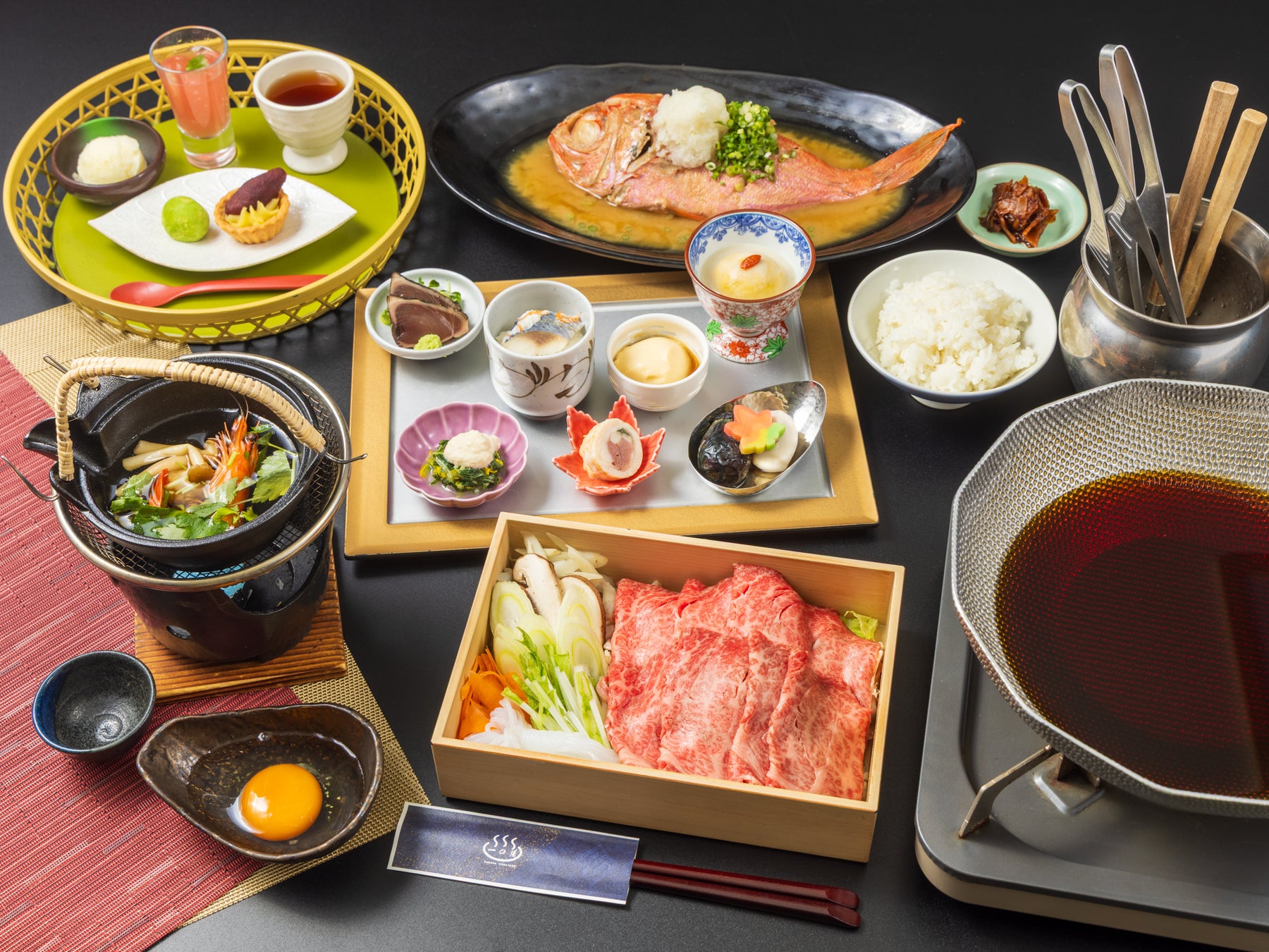 お食事は、陽だまり一の湯ではこだわりの創作和食でお料理を満喫できるプランでご用意しております。定番の金目鯛の煮付けや、米沢牛のすき焼きなど季節のものや一の湯伝統のお食事をこだわって提供しております。ぜひご賞味ください。