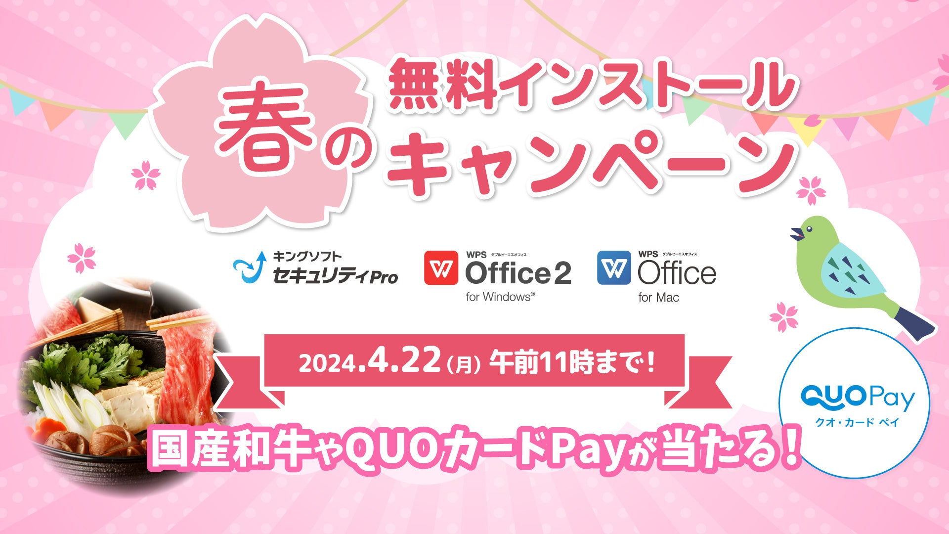 キングソフト株式会社(本社:東京都港区、代表取締役社長:瀬沼 悠)は、オフィスソフト「WPS Office 2」「WPS Office for Mac」の体験版、セキュリティソフト「キングソフトセキュリティPro」の無料版を対象に、プレゼントキャンペーン「春の無料インストールキャンペーン」を4月22日(月)まで開催いたします。期間中、対象製品をインストールしてご応募いただいた方の中から抽選で選べる国産和牛ギフトカタログやスマホで使えるデジタルギフトQUOカードPayが当たります。また、ご応募いただいた方にもれなく「キングソフト公式オンラインショップ」で使えるクーポンをプレゼントします。