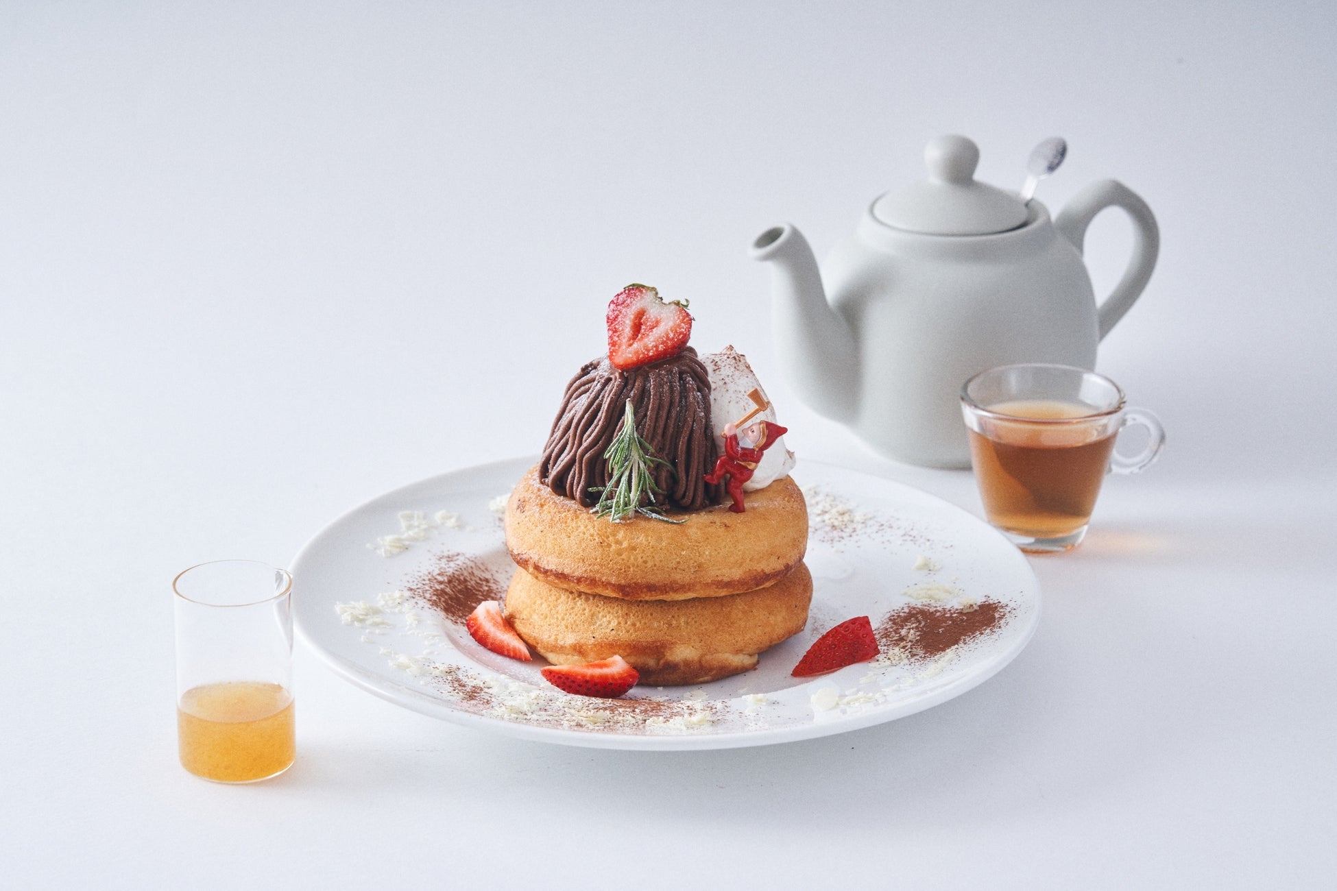 濃厚な塩キャラメルチョコレートのモンブランクリームをたっぷりと絞ったパンケーキに、日本で初めて本格生産した高知県春野町の「土佐ベルガモット」を組み合わせ、華やかで優雅な味わいに仕立てました。塩キャラメルの甘塩っぱさが絶妙なチョコレートの風味に土佐ベルガモットの心華やぐアロマティックな後味。クリスマス気分をよりいっそう彩る、くつろぎの一皿です。