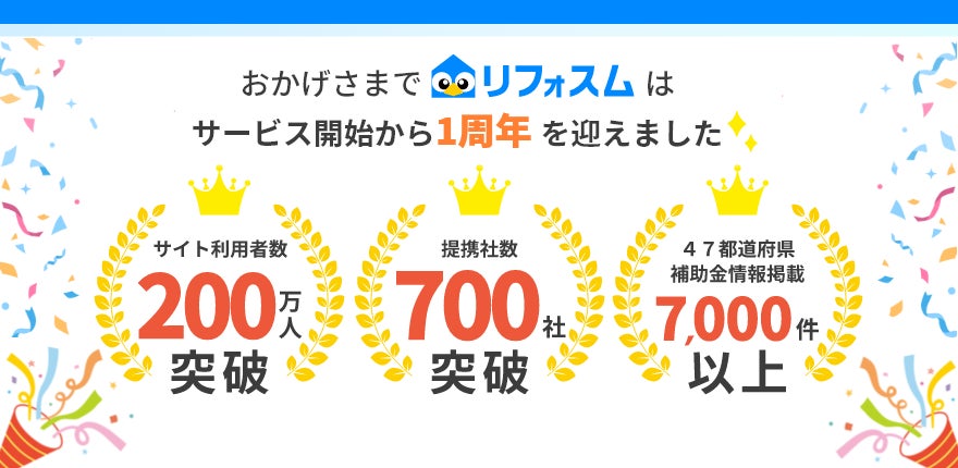株式会社Speee(本社:東京都港区、代表取締役:大塚英樹、東証スタンダード市場:4499、以下「Speee」)の提供する「リフォスム」が、正式サービス提供開始から1年となりました。この1年でのべ200万人の方にご利用いただき、700社のリフォーム会社様にご参画いただいております。