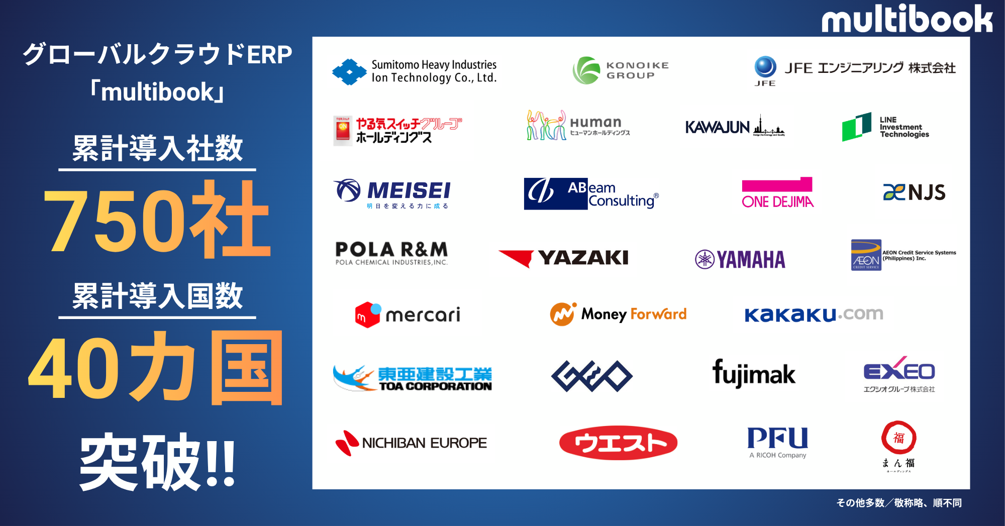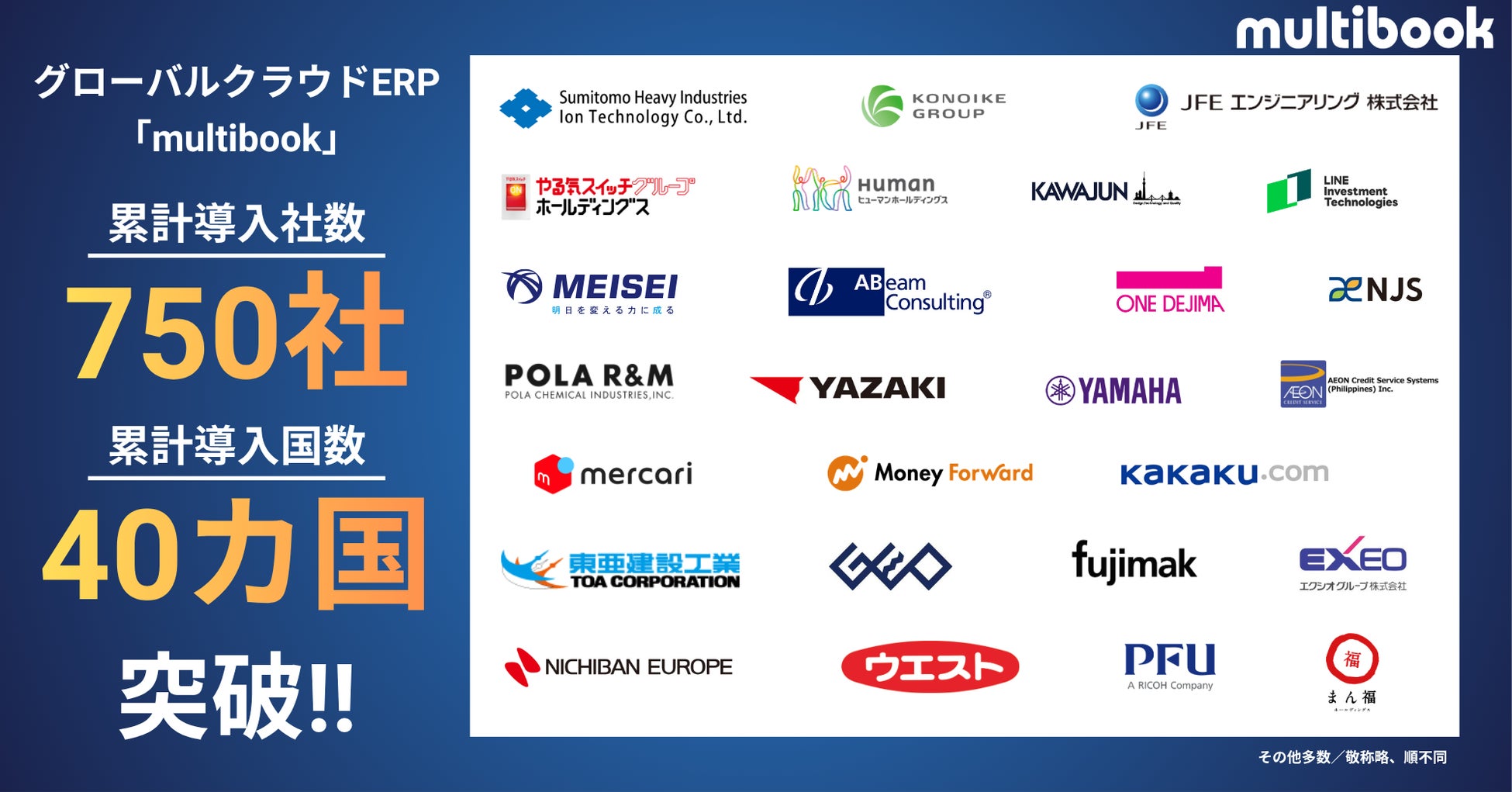 株式会社マルチブック(東京都品川区、代表取締役社長:渡部 学、以下「当社」)は、当社が提供するグローバルクラウドERPサービス「multibook(マルチブック)」について、2026年4月24日時点での累計導入企業数が750社、累計導入国数が40カ国を突破しましたことをお知らせします。
