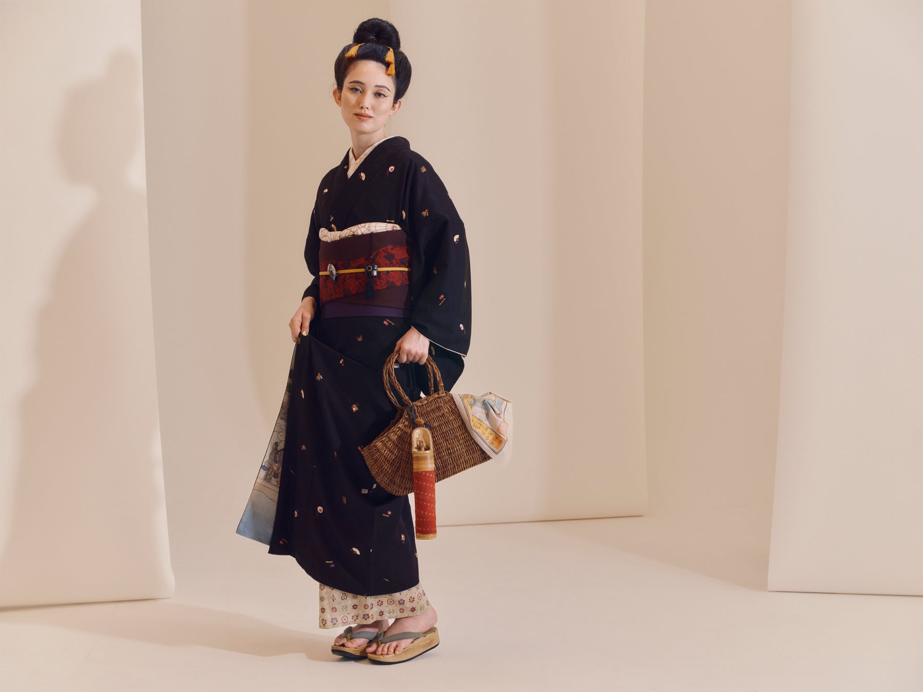 今季の『江戸日和』では、“江戸の道中”をテーマに、旅にまつわるモチーフや情景を〈きものやまと〉ならではの感性でデザイン。コーディネートで、当時の人々の粋を現代に映します。
