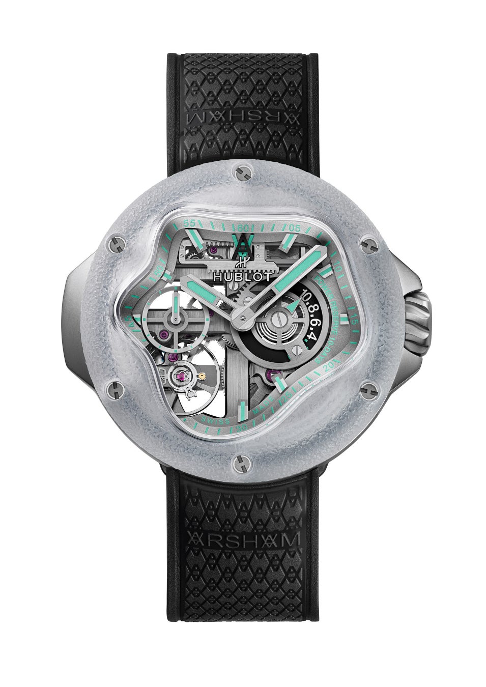 最も特徴的なのは、フロスト加工を施したサファイアクリスタル製のベゼルと文字盤上の印象的なスプラッシュ(水しぶき)型の開口部であり、これは「MP-16 アーシャム ドロップレット(水滴)」のインスピレーションから進化したものです。42mmのコンパクトなケースサイズには、ウブロの新しい、より小型の手巻きムーブメント「メカ-10」を搭載しています。ベゼルとケースバックにある6つのH型ビス、3時と9時の独特なラグ、チタニウム製のH型フォールディングクラスプなど、ウブロの特徴的な要素が存在しています。アーシャムグリーンは、時針と分針、数字、時間と5分ごとのマーカー、9時位置のスモールセコンド針、そして3時位置のパワーリザーブインジケーターに見られます。