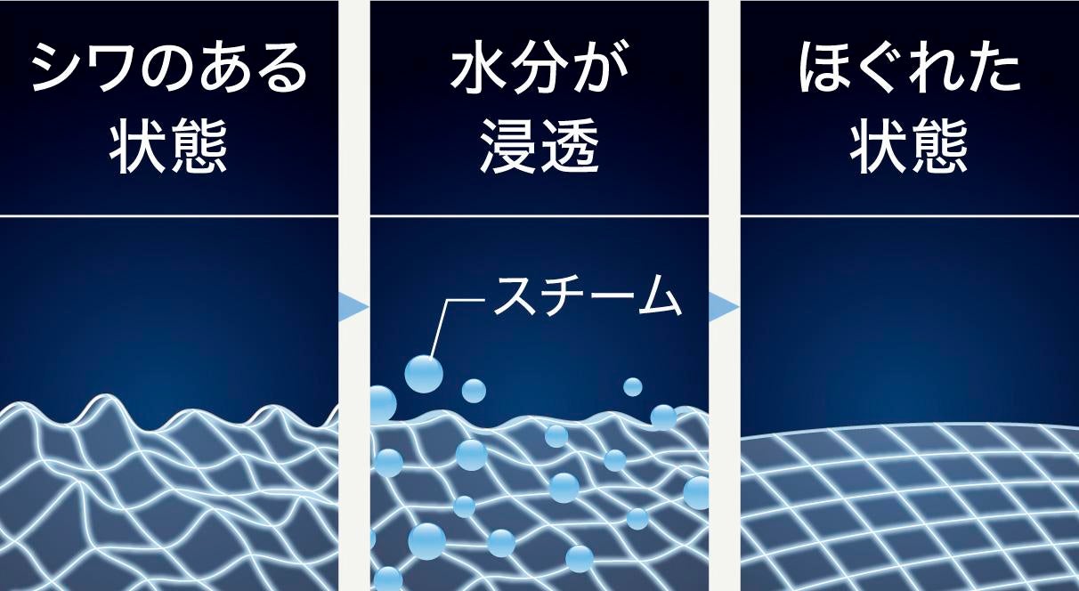 衣類のシワの原因は、絡みついたまま乾燥した繊維。スチームで水分を与えて「ほぐす」ことでシワを伸ばします。シワ伸ばしのポイントは繊維の奥までしっかり水分を浸透させること。スチーム量が多いほど浸透効果は高まり、スチームが繊維の奥までしっかり浸透し、繊維がほぐれシワが伸びやすくなります。