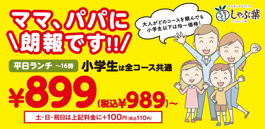 しゃぶ葉 小学生は全食べ放題コース(※1)が均一価格に!国産牛のコースでも税込989円~!?