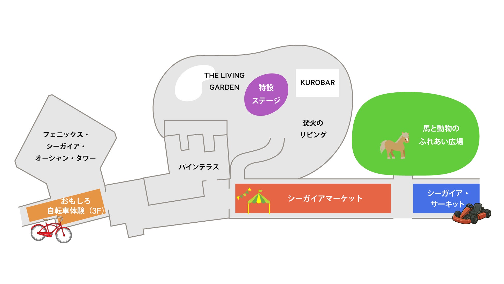 「シーガイア フェスティバル」では、シーガイアだけでなく全国のマイステイズのグループホテルから選りすぐりの全国のお土産などが大集合する「シーガイアマーケット」をはじめ、スパリゾートハワイアンズ(福島県いわき市)の「ポリネシアンショー」や、空庭温泉 OSAKA BAY TOWER(大阪府大阪市、以下空庭温泉)のエンタメショー『鼠小僧、大暴れ!』などの多彩なステージイベントなど、マイステイズの魅力を活かした企画が勢揃い。さらにシーガイアの新アクティビティー「シーガイア・サーキット(電動ゴーカート)」や「おもしろ自転車」などの体験コーナーもご用意しています。