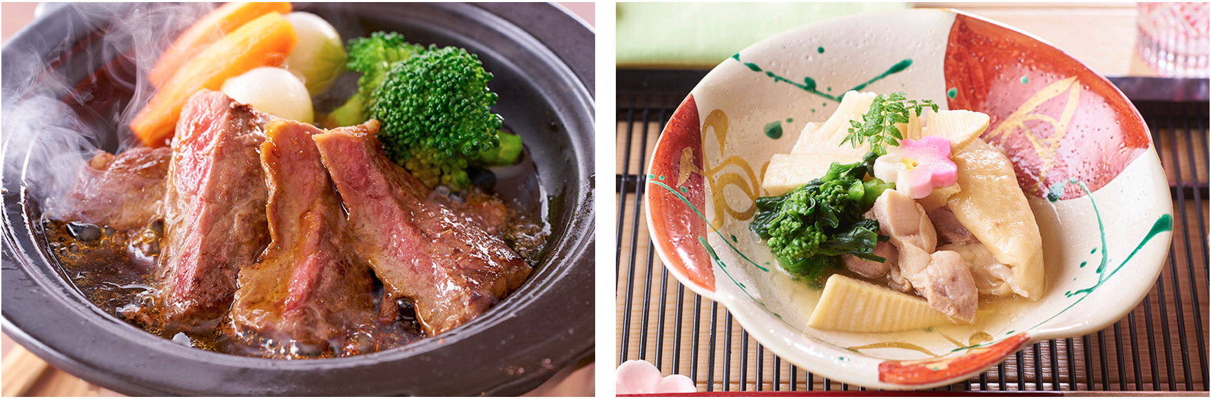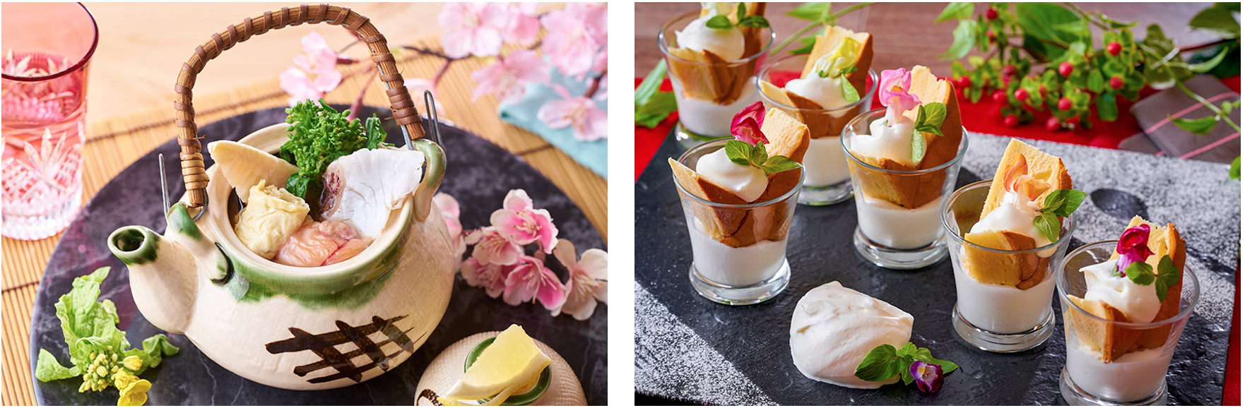 テーブル上の陶板で焼き上げるサーロインステーキの他にも、職人が目の前で握りたてをご提供する握り寿司など、ご馳走メニューが目白押し。他にも春の食材を使った一品、軽やかな食感の創作メニュー、「いちご」を使ったスイーツなど、目でも舌でも、春を満喫する美味しさでおもてなしします。