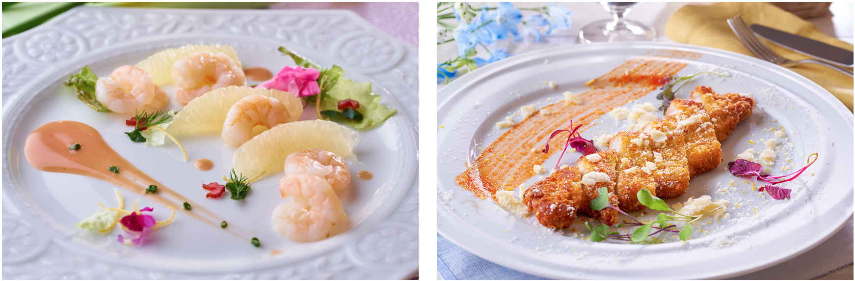 軽やかなテイストの料理を提供することが日光霧降のこだわり。白ワインにぴったりの海鮮冷菜、ドイツの伝統料理など、高原リゾートらしさ溢れるメニューをお楽しみください。栃木県のブランドフィッシュ、日光サーモンのお造りなど、どなたにも親しみやすい美味しさもご用意して、おもてなしいたします。