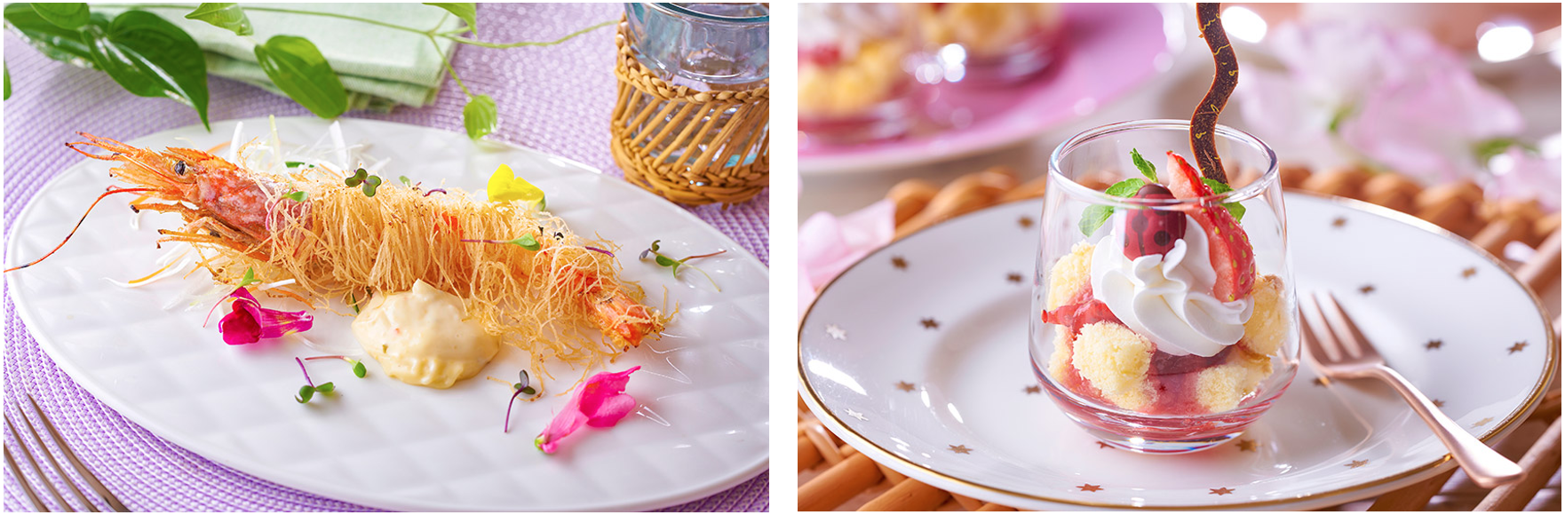 右:濃厚な生クリームと優しい甘さのスポンジケーキ、そして酸味があってジューシーないちごを重ねてご提供する「いちごのトライフル」。さっぱりとした口当たりでお腹いっぱいでも、つい手が伸びる美味しさです。