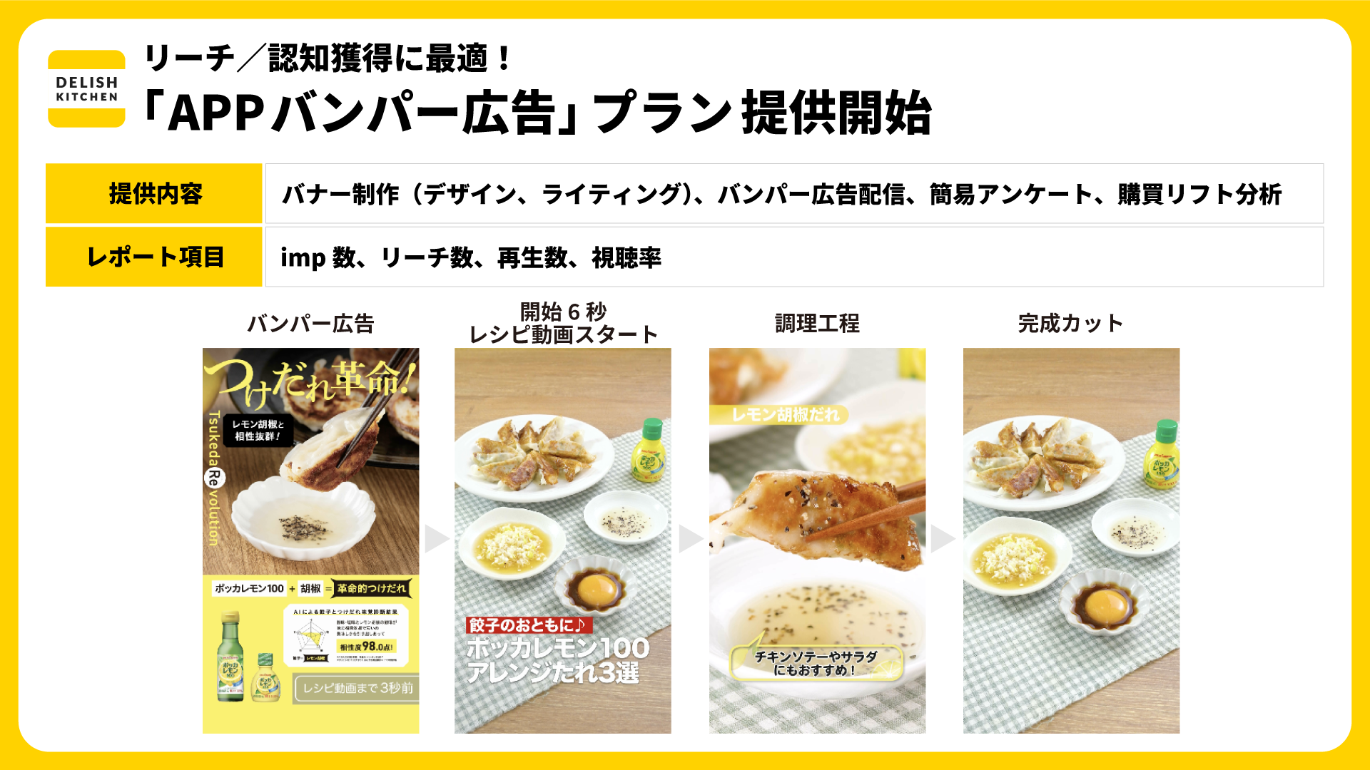 この度、『DELISH KITCHEN』アプリを起動した際に表示される「バンパー広告配信」の販売を正式に開始いたします。
