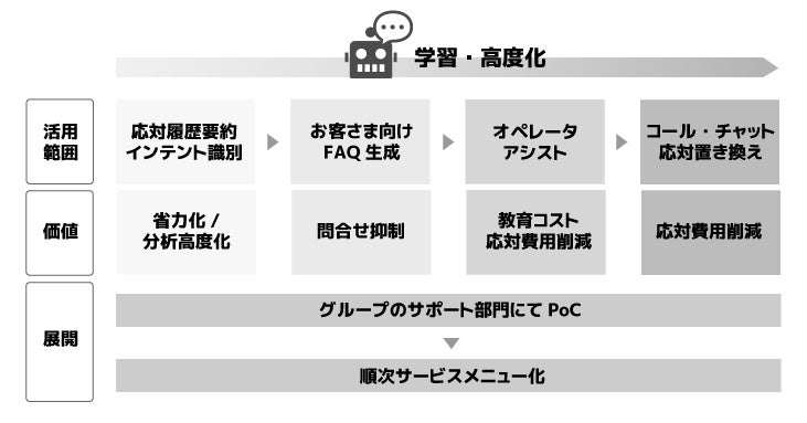 これまで人的工数が発生した業務に活用することにより、業務効率化を図るとともに、LLMベースの生成系AIの理解を深め、期待どおりの回答を得るためのプロンプトの知見・ノウハウや、自動生成する回答の情報精度を見極める力を養い、社内やBPO・コンタクトセンター事業への効果的な活用アイデアの創出を図ります。