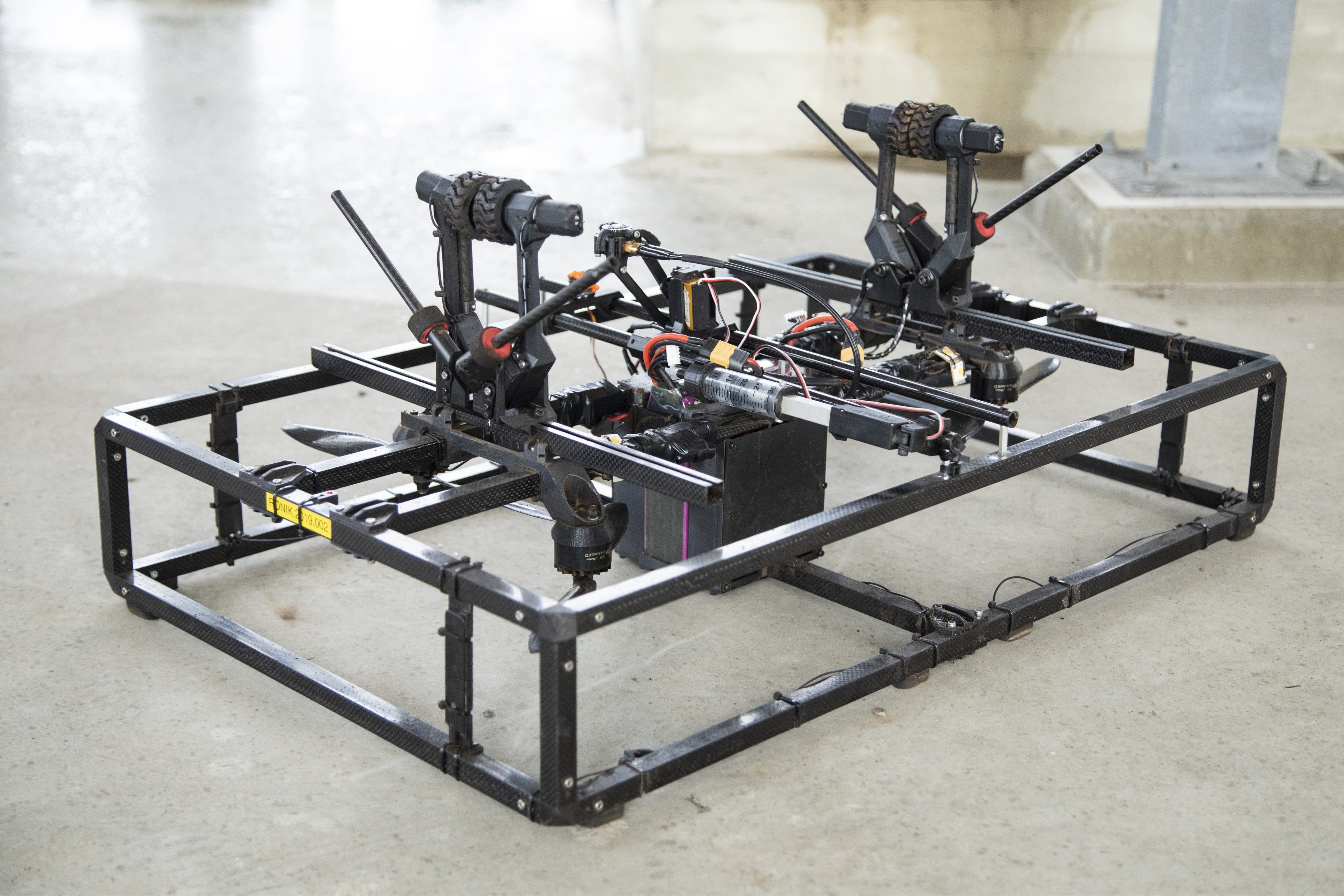 ドローンとして初めての技術であるタンクなどの表面を壊さず板厚点検が可能な超音波探傷機能を搭載した自社製の「UTドローン」は、接触触媒(カプラント)ディスペンサーが搭載されており、飛行中でも探触子にカプラントの供給が可能であるため、効率的に検査を進めることができます。また、3つの高精度カメラが搭載されており、飛行中のドローンからの映像、またUTグラフを地上から即時的に確認することも可能です。