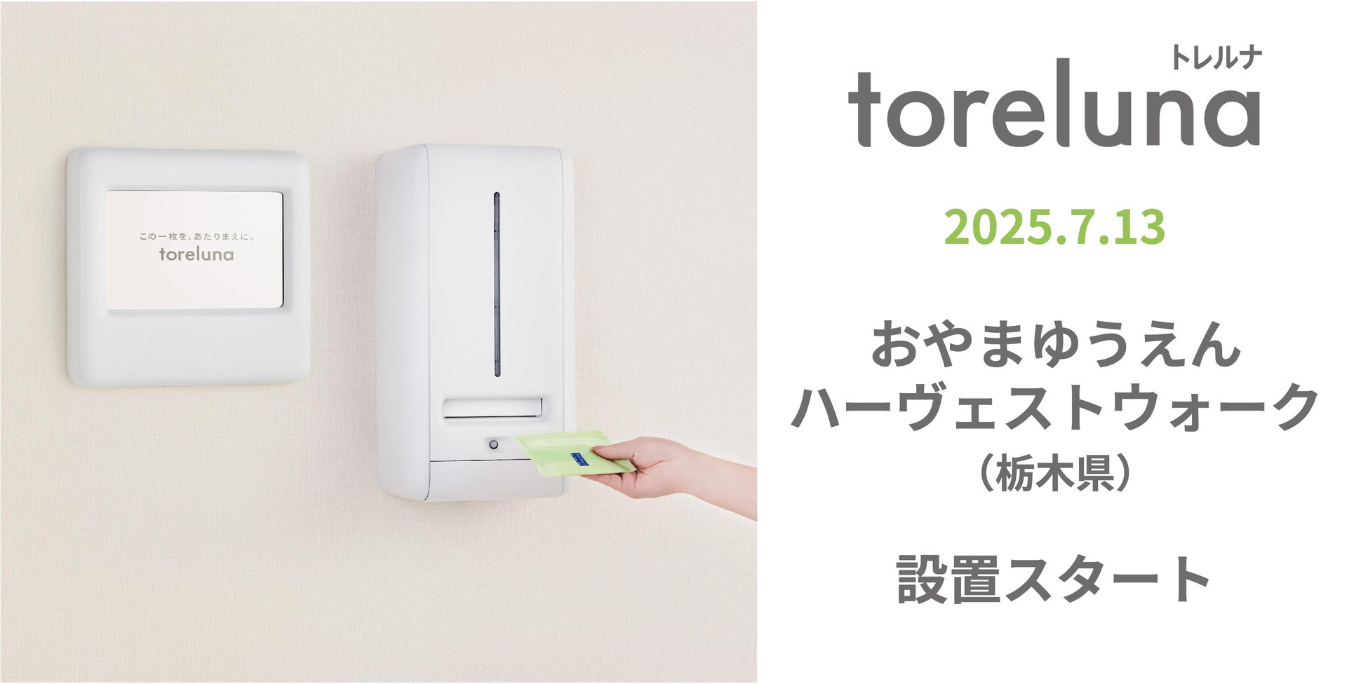 株式会社ネクイノ(大阪市北区、代表:石井 健一)は、トイレの個室で生理用ナプキンを常備し無料で提供するサービス「toreluna(トレルナ)」(以下 トレルナ)を、おやまゆうえんハーヴェストウォークへ設置し、サービスの提供を開始いたしました。なお、栃木県での本サービスの設置は初めての取り組みとなります。