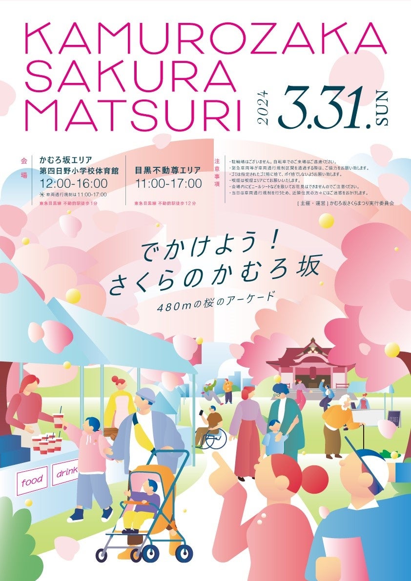 東京都品川区の不動前エリアで開催される「かむろ坂さくらまつり」は、都内屈指の美しさを誇る480mの桜のアーチの下の車道に交通規制をかけて歩けるようになるイベントです。地元人気店による飲食ブースを始め、地域の方々による活動発表など、幅広い年代の方が桜並木に集う1日です。