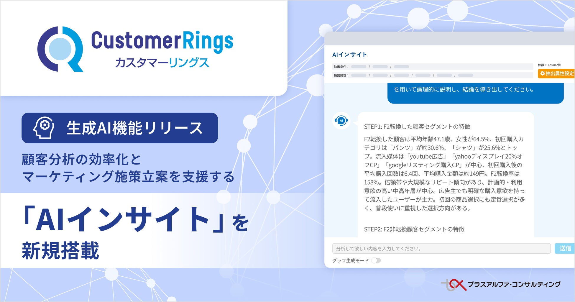 株式会社プラスアルファ・コンサルティング(本社:東京都港区、代表取締役社長:三室克哉 証券コード:4071))は、CRM/MAツール 「CustomerRings(以下:カスタマーリングス)」 に、生成AIを活用した対話型分析機能 「AIインサイト」 を新規搭載しました。