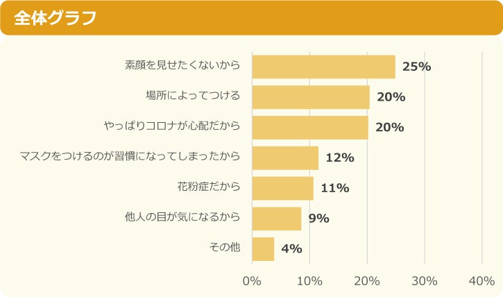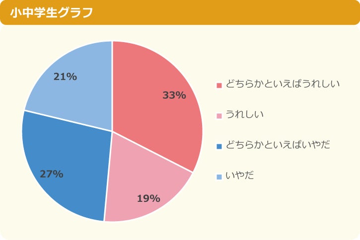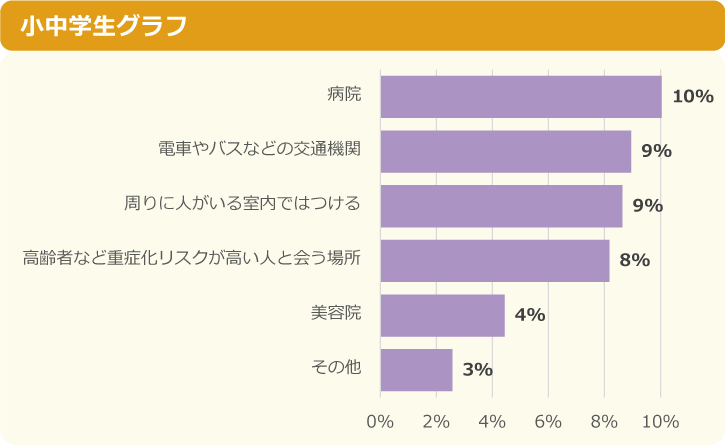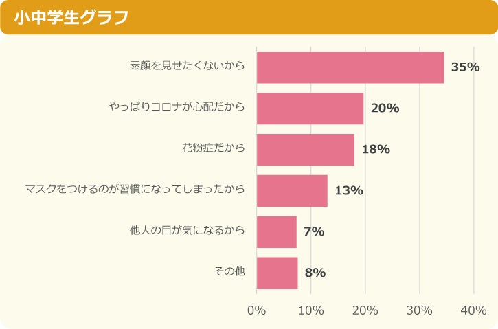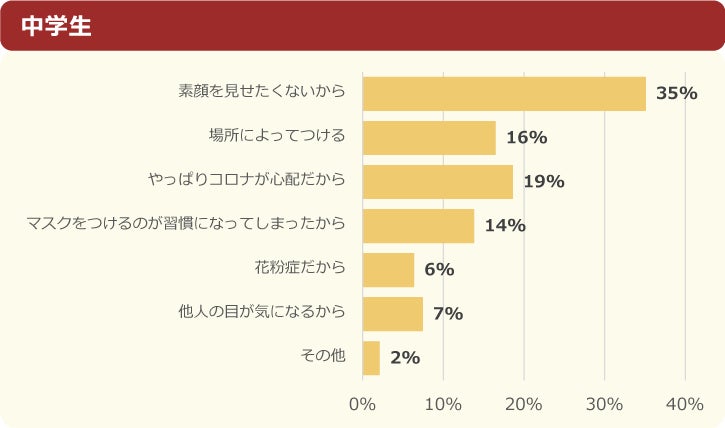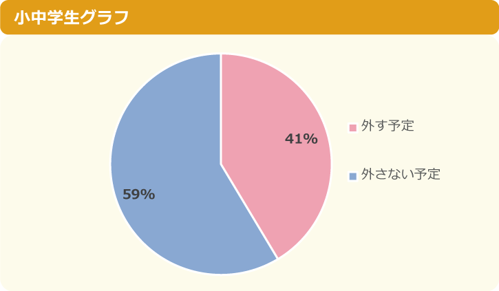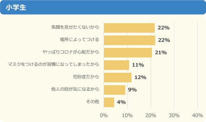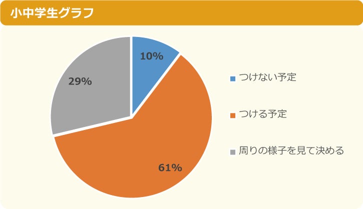 マスクの着用が個人の判断に任せられることについては意見が分かれているようで、今後も学校でマスクを着用する予定と回答した人は68%でしたが、普段の生活で着用予定の人は61%でした。マスク着用理由の1位は、学校と普段の生活どちらの質問でも「素顔を見せたくないから」で、学校では特にマスクを外した顔を見られることに抵抗がある子どもたちが多いことがわかりました。新型コロナウイルスによるマスク着用が3年ほど続いたことで、マスクを外した素顔を見せることに抵抗が出てきてしまったと考えられます。