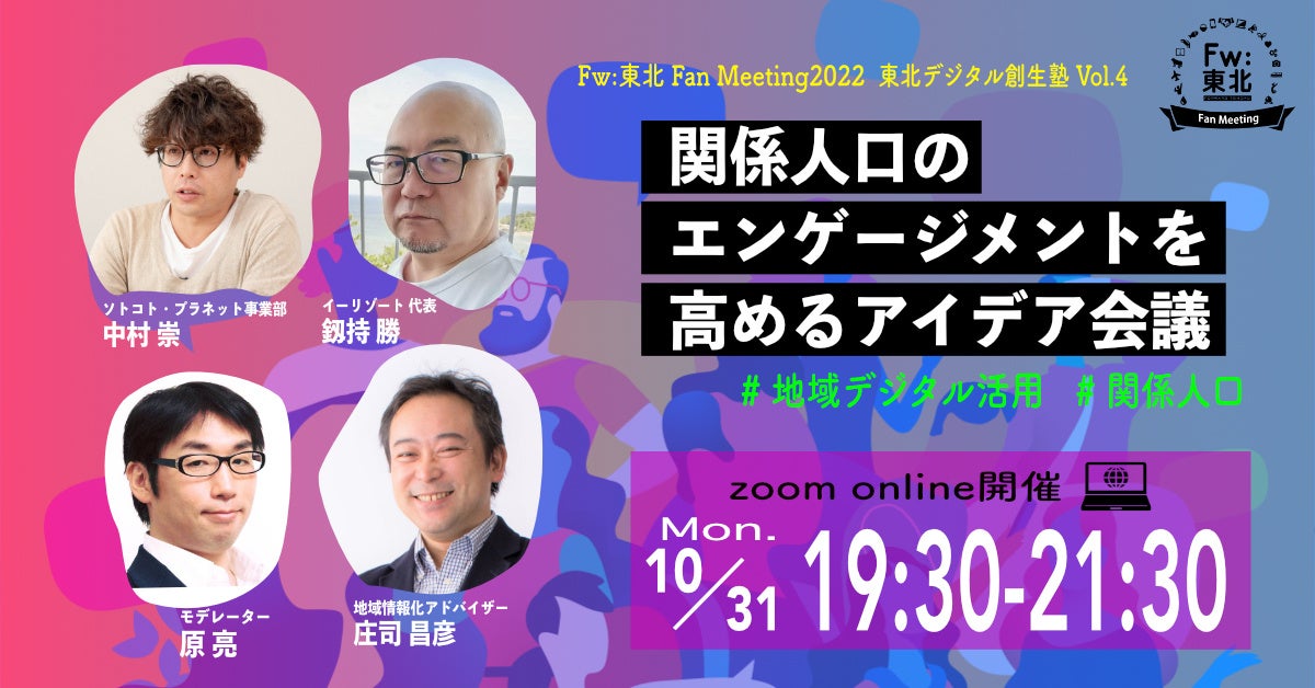 エイチタス株式会社(本社:東京都品川区、代表取締役:原 亮/小澤 剛)は、復興庁主催のワークショップ「Fw:東北(フォワードとうほく)Fan Meeting」にて、「東北デジタル創生塾Vol.4 〜めざせ移住促進!関係人口アイデア会議~地域と人の結びつきをデジタルで強めるには?」の企画運営を行い、10月31日夜に無料のZoomミーティングを開催します。