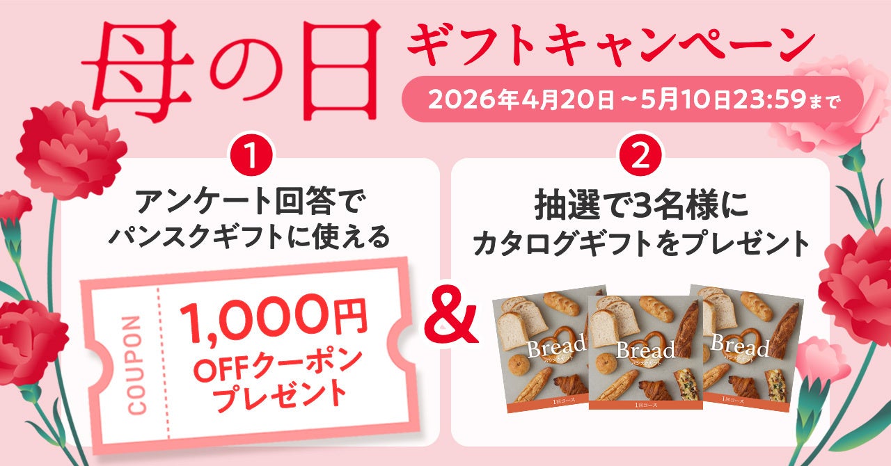 株式会社パンフォーユー(本社:群馬県桐生市、代表取締役:矢野健太)は、母の日に合わせて「母の日アンケートキャンペーン」を実施いたします。アンケートにお答えいただいた全員に、「パンスクギフト(https://gift.pansuku.com/)」で使える1,000円OFFクーポンをプレゼントします。