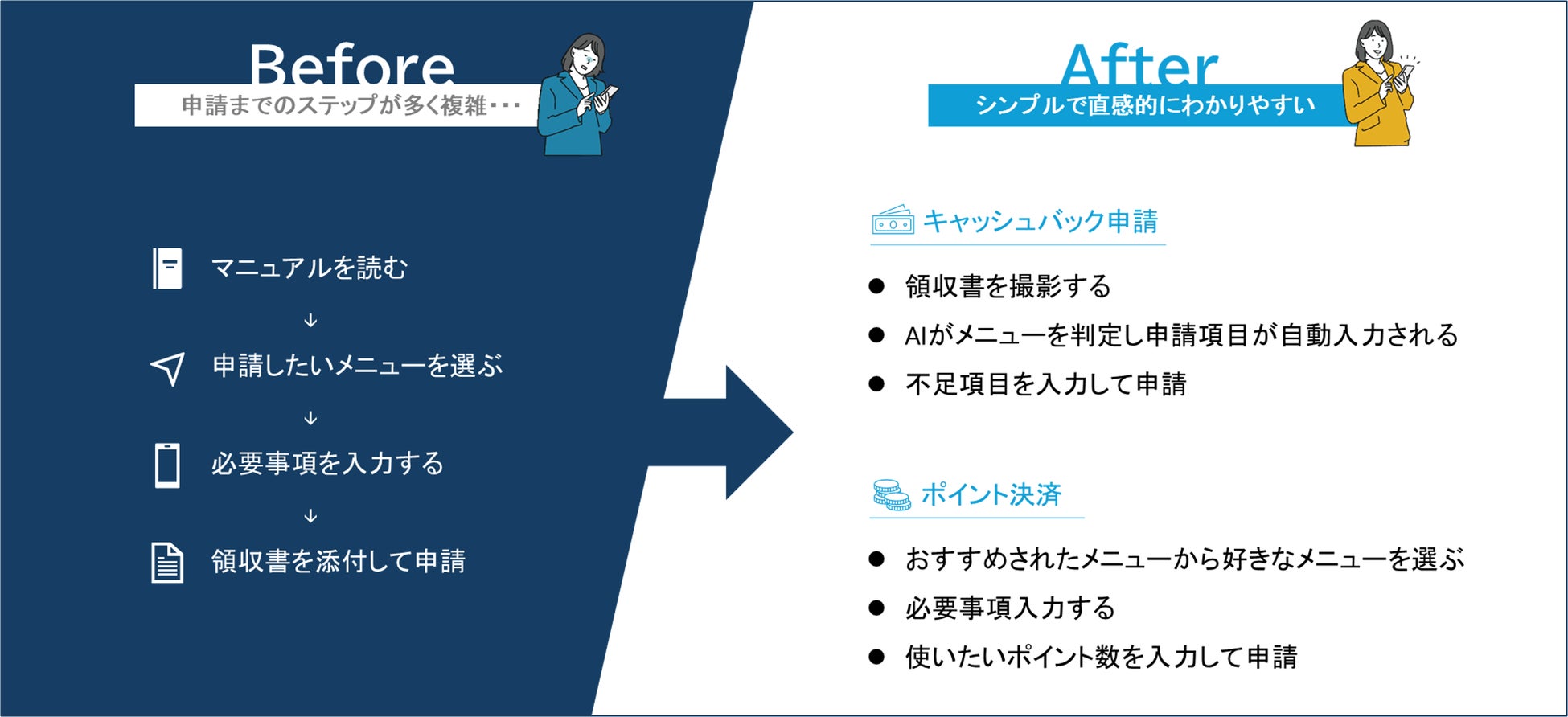 あわせて、UI(User Interface〈ユーザーインターフェース〉)を向上させ、事務的な申請画面から、必要な情報を自然に得られるサイトへと進化させています。さらに、領収書を撮影するだけで申請項目が自動入力される仕組みを取り入れるなど、操作面におけるUI/UXも進化させ、日常的に使いやすいカフェテリアプランを実現しています。