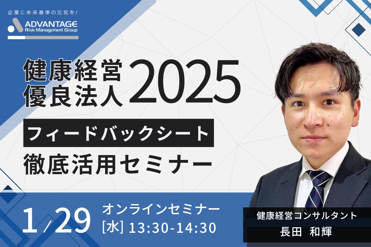 株式会社アドバンテッジリスクマネジメントは、2025年1月29日(水)に健康経営部門のご担当者様を対象としたWebセミナー「健康経営優良法人2025フィードバックシート徹底活用セミナー」を開催いたします。本セミナーは今年度速報・調査票ポイントのおさらいをすると共に、健康経営度調査フィードバックシートを用いた振り返り、各種健康データの分析/活用方法など、次年度に向けて今から準備できる内容を、実際に調査票の回答や施策実施をサポートしているコンサルタントが解説します。