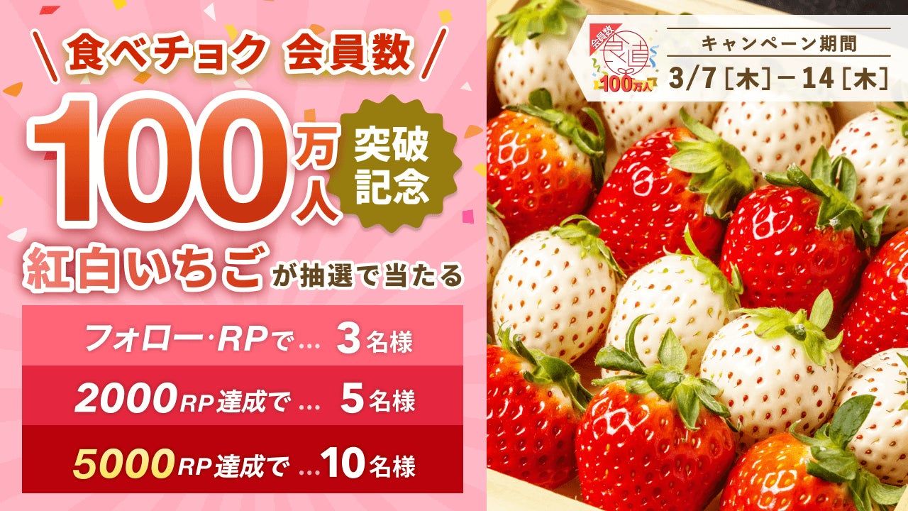 登録会員数100万人突破を記念し、食べチョク公式Xアカウントのフォロー&リポスト(RP)すると「紅白いちごセット」が最大10名様に当たるキャンペーンを実施いたします。