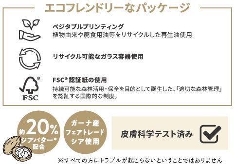 植物由来の界面活性剤を使用し、貴重なシアアブソリュート(シア脂油)と厳選されたボタニカルオイル4種*(いずれも保湿・柔軟成分)を配合。肌をなめらかに洗い上げ、うるおいに満ちたやわらかな肌に導きます。