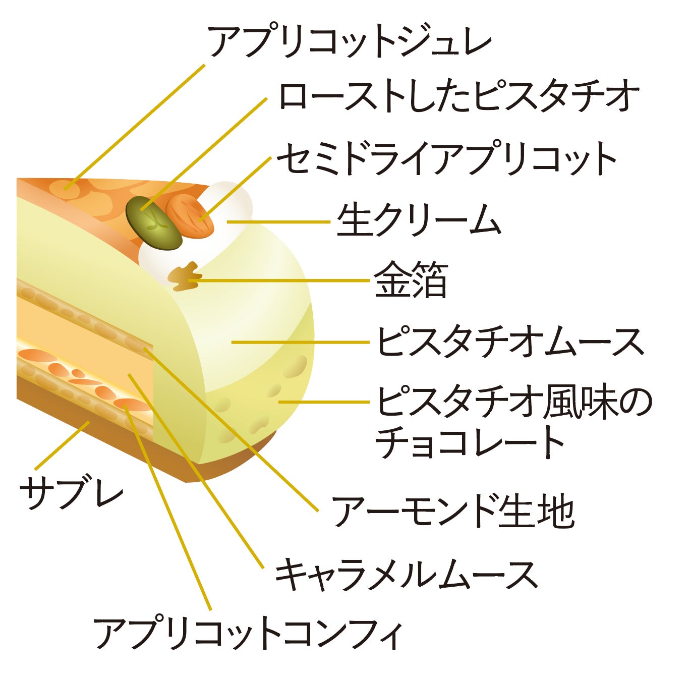 濃厚なピスタチオムースとアプリコットの甘酸っぱさとほろ苦いキャラメルムースが調和。コクのある甘さや爽やかな酸味が豊かなハーモニーを奏でます。