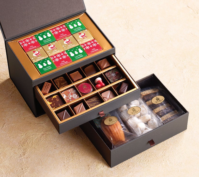 和光で人気の焼菓子やチョコレートを3段に詰めた、まるで宝石箱のようなボックスです。上段にはクリスマス限定パッケージに包んだ「キャレ ド ショコラ ノエル」、中段には「ショコラ フレ ノエル」15個セット、下段には、バターのコクが効いた贅沢な味わいのマドレーヌとフィナンシェ、このギフトボックス⽤にシェフが考案したブールドネージュ、⼈気のクッキー「ラ メゾン」から紅茶フレーバーを効かせた爽やかな味わい “ナチュール”、“ショコラ”の2種が入っています。