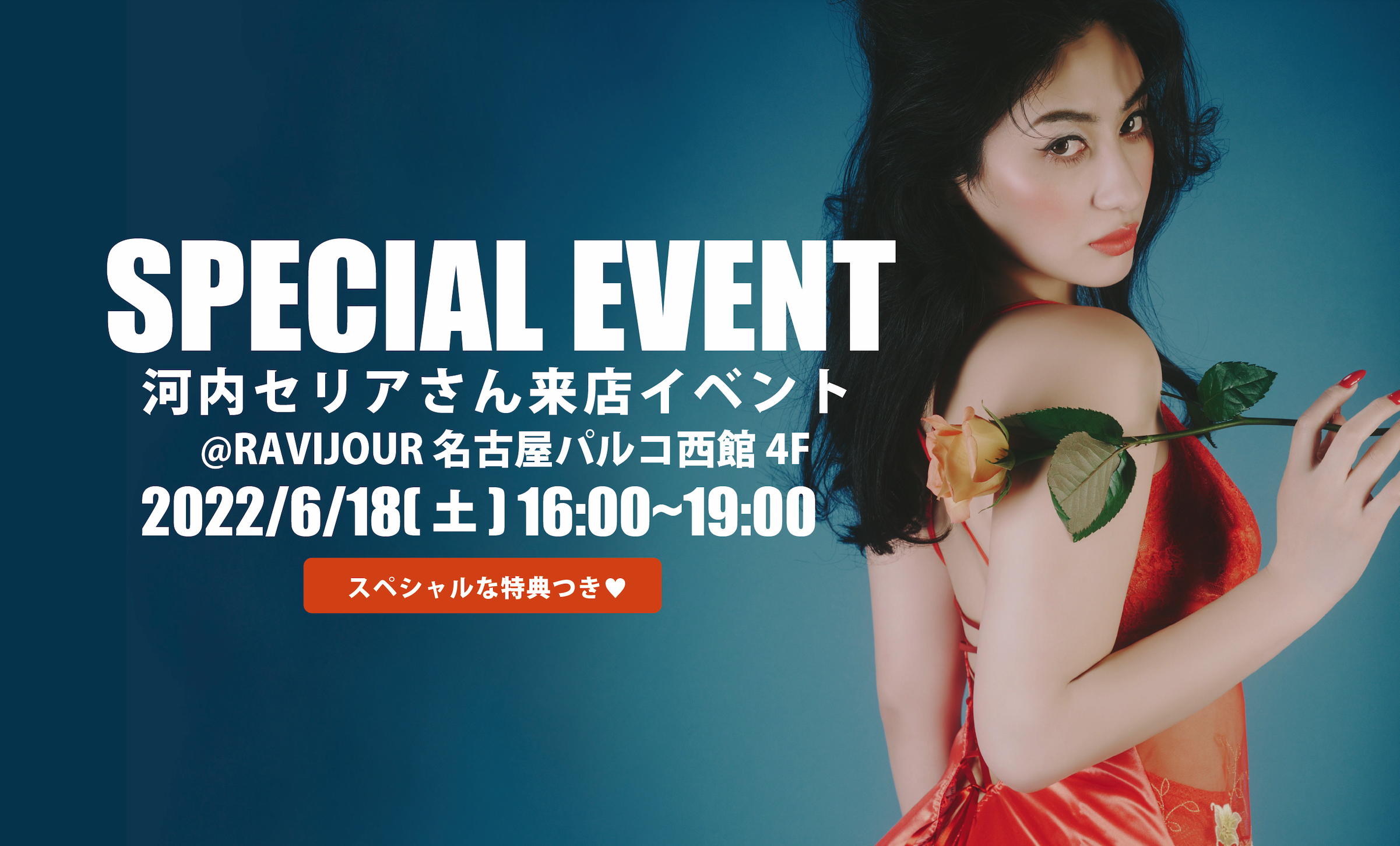 【6/18(土)16:00-19:00開催】RAVIJOUR名古屋パルコにて、モデルの河内セリアさん来店イベント第3弾が開催決定!限定でスペシャルな特典もご用意。