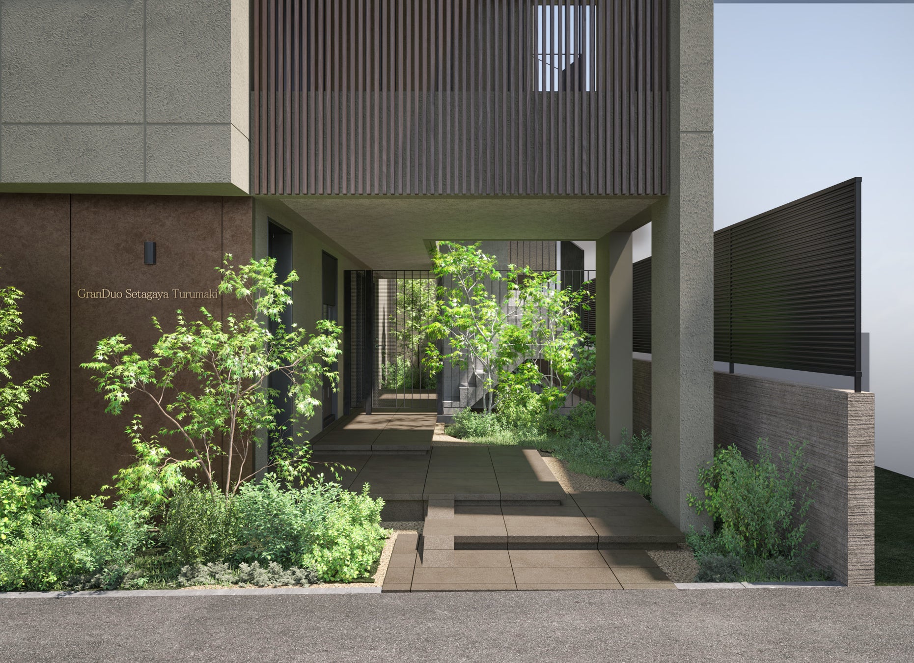 エントランスと共⽤部には緑豊かな植栽を十分に配置するとともに、住⼾へ向かう通路を蛇⾏させることで、まるで散歩をしているような感覚になるよう工夫しました。