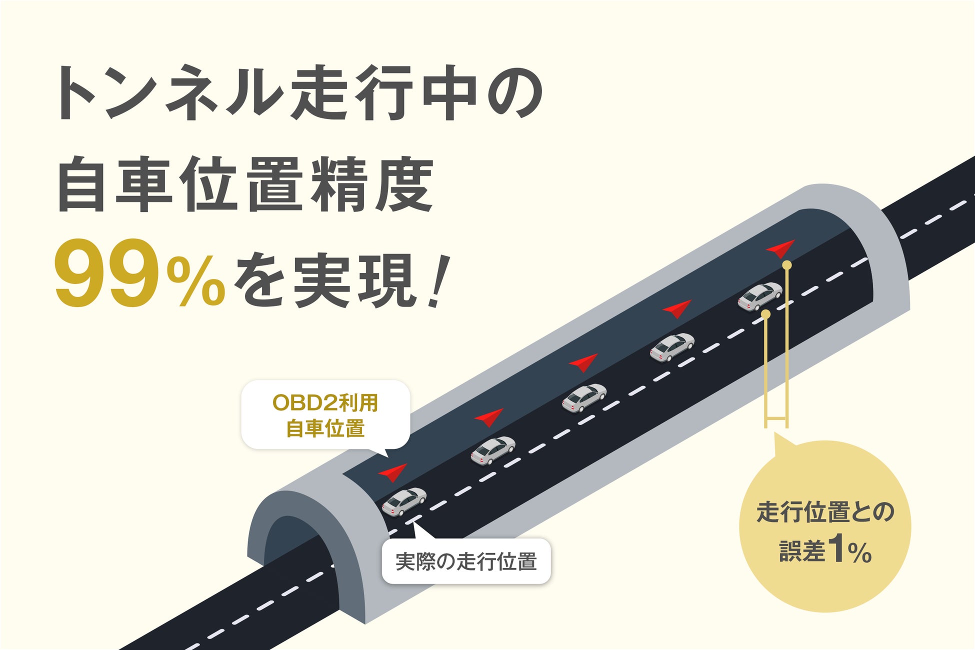 当社で実施した実地調査では、全長18.2㎞の首都高速道路中央環状線の山手トンネルにおいても、自車位置精度は約99%となっています。