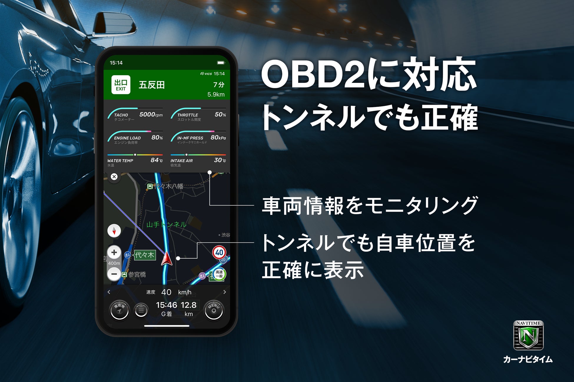 『カーナビタイム』、OBD2接続に対応し、トンネル内での正確な自車位置測位が可能に