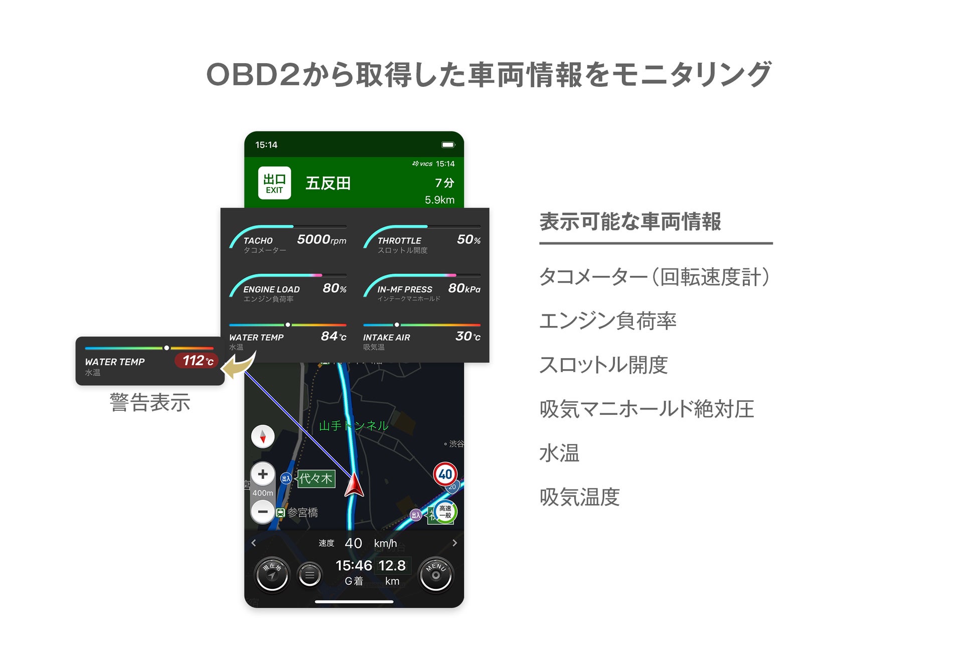 ②エンジン回転数やエンジン負荷率などの車両情報をアプリ画面上でモニタリング可能に