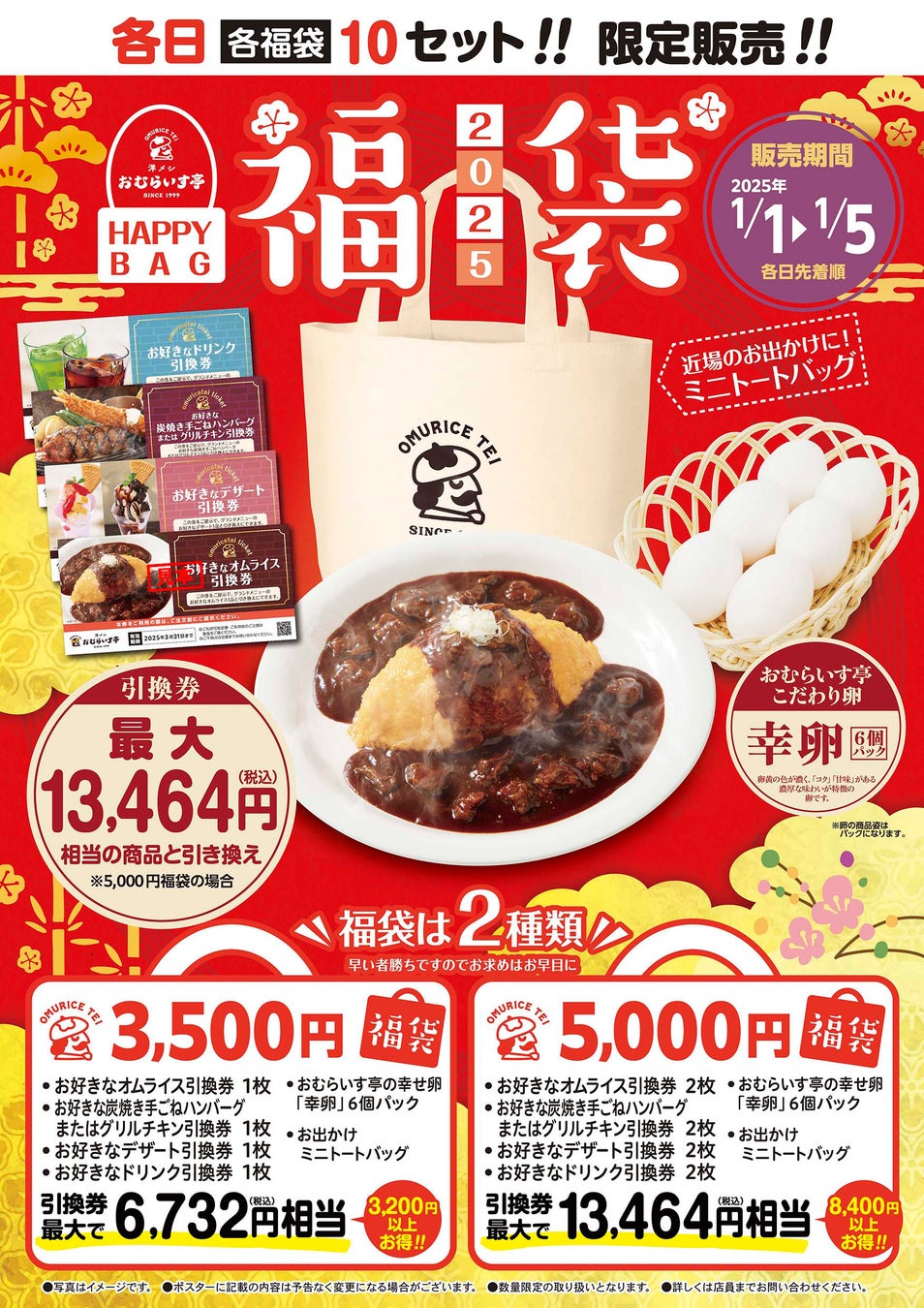 本年も残り少なくなりました。今年一年のご愛顧に「おむらいす亭」スタッフ一同感謝を申し上げます。そして2025年・元日より1月5日(日)まで各日 2種類の「福袋(炭焼レストラン パン食べ放題付き・バージョン)」を各10セット(合計20セット)販売いたします。内容はおむらいす亭こだわりの卵「幸卵」6個パックに特製ミニトートバッグ、そしてオムライス・炭焼き手ごねハンバーグ または グリルチキン・デザート・ドリンク、それぞれの引換券でございます。早い者勝ちですのでお求めはお早めにお願いいたします。新春より皆さまのご来店をスタッフ一同お待ちしております。※福袋販売・炭焼レストラン パン食べ放題付き実施店舗は下記に記載させていただきます。