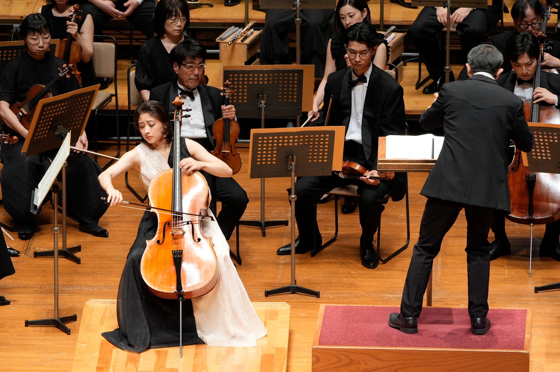 第1楽章冒頭、ユーモラスな主題をチェロが奏ではじめます。最初はやや緊張した面持ちでしたが、次第に驚くべき集中力で音楽に没入していく鳥羽さん。かといって、決してまわりが見えなくなるような没入ぶりではなく、絶えず指揮者に視線を投げ、オーケストラとぴったり合わせるアンサンブル能力は卓越したもの。ソリストとしてオーケストラと対峙するというより、みずからもオーケストラの一員として演奏している感覚なのかもしれません。穏やかな第2楽章では、ヴィブラートをかけてエモーショナルに歌いながらも、すっとした清潔感のある音色が魅力的。分裂的に明滅するさまざまな感情を精緻に描き出していきます。そして第3楽章は、オーケストラなしの独奏によるカデンツァ。舞台でたったひとり、自己の内面にある深淵を覗き込むような旋律を、バッハのように厳かに、堂々と奏でるさまは、とても20歳とは思えません。第4楽章はオーケストラと一体となってクライマックスへとのぼりつめ、鮮烈な響きとともに幕を閉じました。