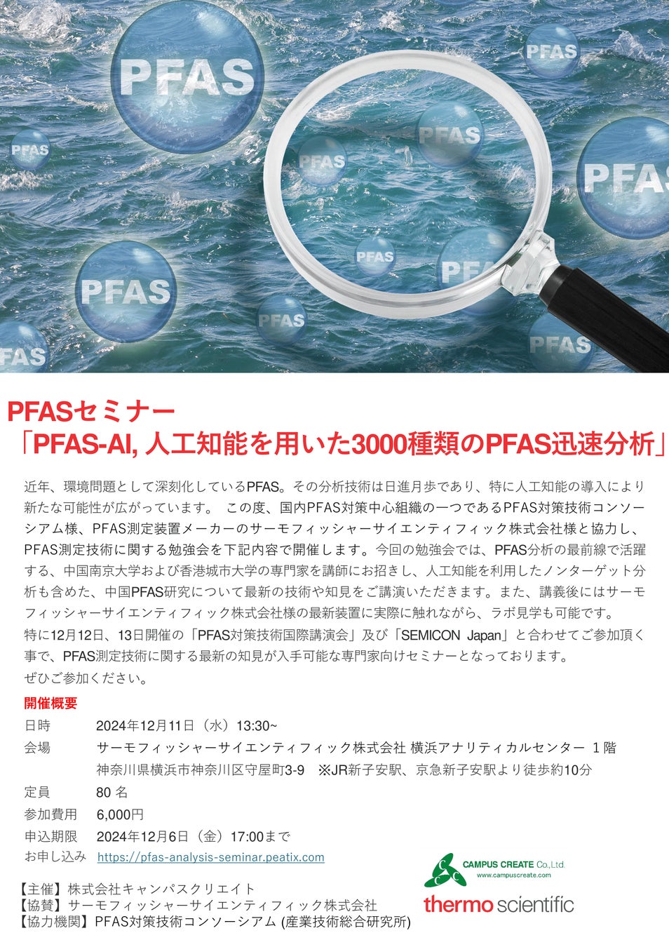 株式会社キャンパスクリエイトは、PFAS対策技術コンソーシアム、サーモフィッシャーサイエンティフィック株式会社と協力し、PFAS測定技術に関する勉強会を12月11日に開催致します。