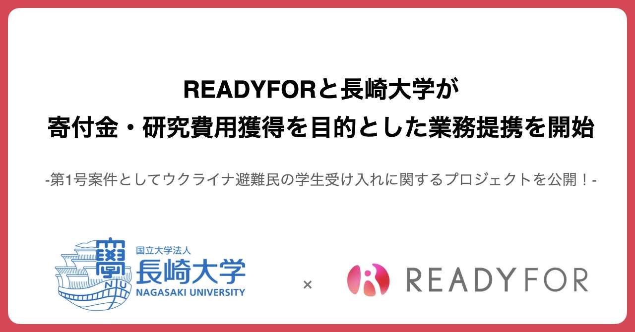 日本初・国内最大級のクラウドファンディングサービス「READYFOR」を運営するREADYFOR株式会社(代表取締役CEO:米良はるか、本社:東京都千代田区)と国立大学法人長崎大学(学長:河野 茂、所在地:長崎県長崎市)は、寄付金・研究費用等獲得を目的としたクラウドファンディング活用に関する業務提携を締結しました。また本日 、締結後初となるクラウドファンディングプロジェクト「長崎大学 学びの場を失ったウクライナの学生たちに学習継続の場を」を公開いたしました。本プロジェクトでは、ウクライナ避難民学生約40名の受け入れにかかる費用総額3,400万円のうち、1,000万円をクラウドファンディングで募ること目標に、本日から7月13日(水)まで寄付金を募集いたします。