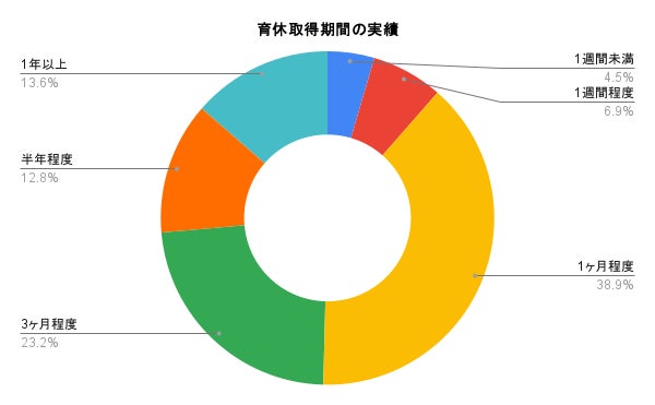 育休の合計取得期間については「1ヶ月程度」(39%)が最も多く、次いで「3か月程度」(23%)、「1年以上」(14%)、「半年程度」(13%)と続き、半年以上の長期取得を行ったパパは26.4%にとどまりました。また、本調査で「ママの育休期間」についても調査したところ、ママの65%が「1年以上」と回答しており、取得期間の長さにおいてパパとの差は依然として存在しています。