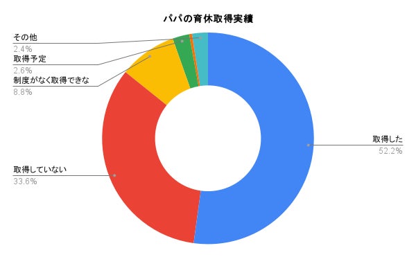 2023年以降に出産したママ738名を対象に、パパの育休取得について調査した結果、「(パパが)育休を取得した」と回答した人は52%となり、約半数が実際に育休を経験していることがわかりました。一方で「取得していない」との回答も34%にのぼり、さらに「制度がなく取得できない」(9%)、「今後取得予定」(3%)という声も一定数見られました。